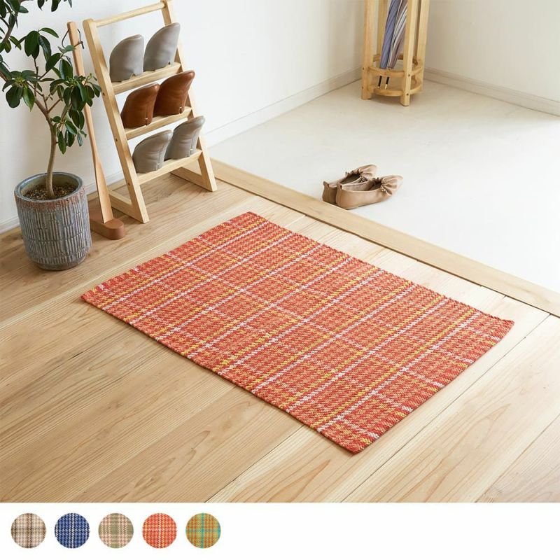 敷くだけで空間の雰囲気をがらりと変えてくれる、ポップなカラーリングと千鳥格子柄が魅力の玄関マット。インド綿ならではのナチュラルで素朴な風合いと明るいカラーがマッチした、玄関だけでなくソファ下やベッドサイド用としてもおすすめの一枚です。