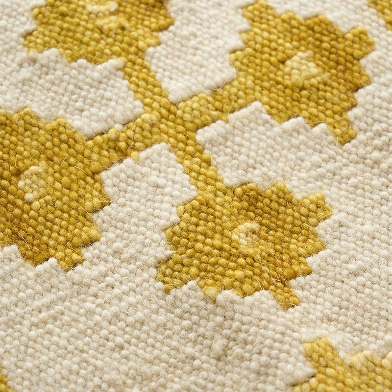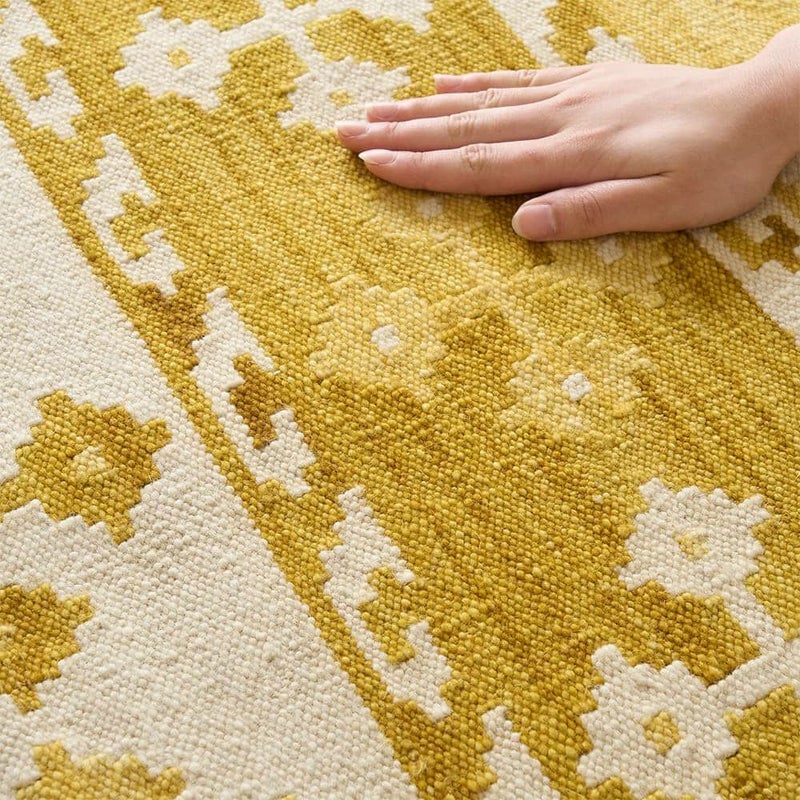 幸福への願いが込められているキリム柄にゴールドを思わせる鮮やかなイエローの生地がマッチした玄関マット。吸湿性に優れ、抗菌消臭にも効果のあるウール素材はまさに玄関マットにぴったり。空間にアクセントを加えてくれるデザイン性と機能性を兼ね備えた一枚をご紹介します。
