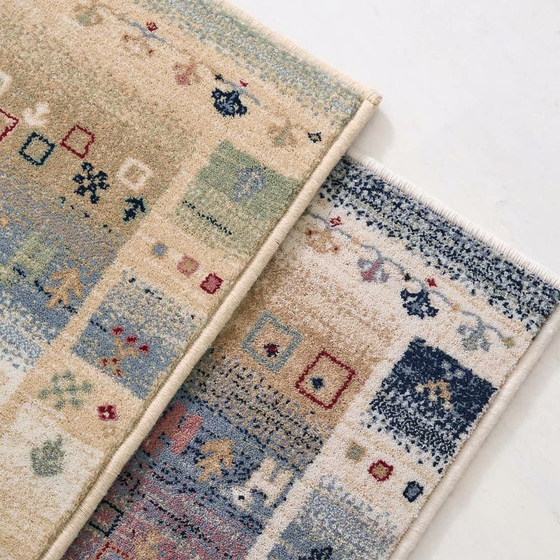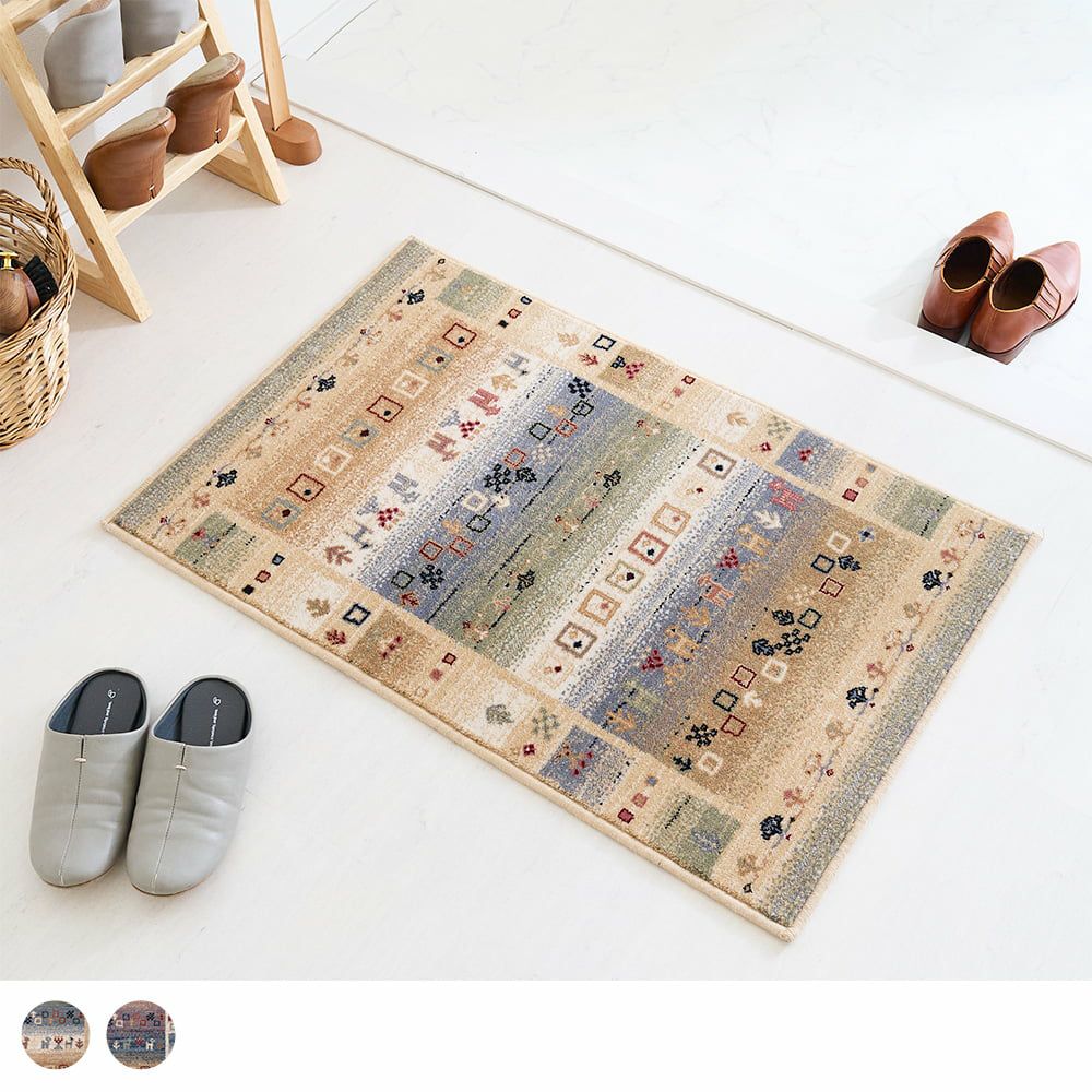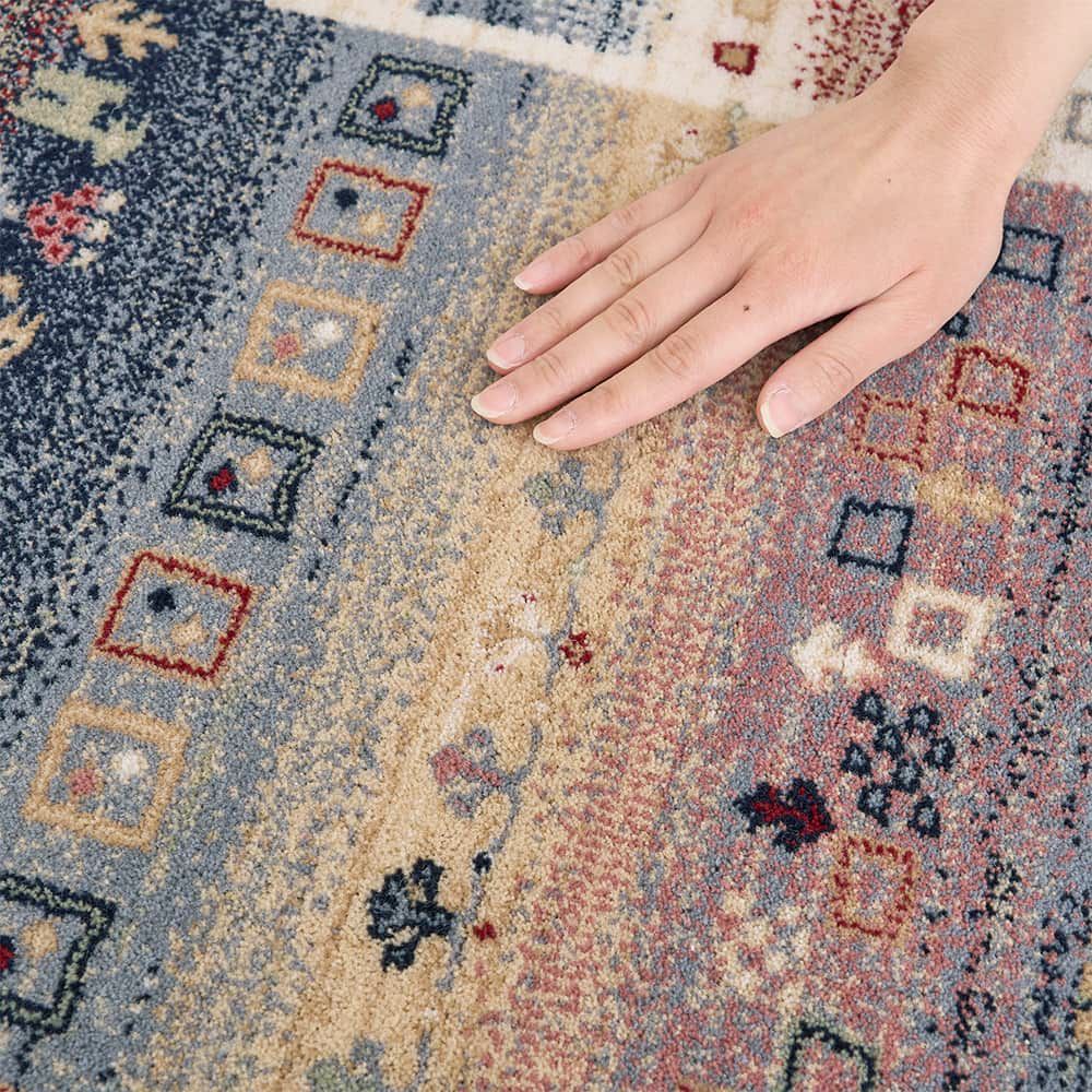 暮れ始めの夕空のような美しいグラデーションや、大地を覆う広い夜空を思わせる淡い色使いがギャッベ柄と調和した、ウール素材のウィルトン織りマット。豊かな自然を感じさせるような穏やかな時間の流れが漂う、優しい風合いの玄関マットです。