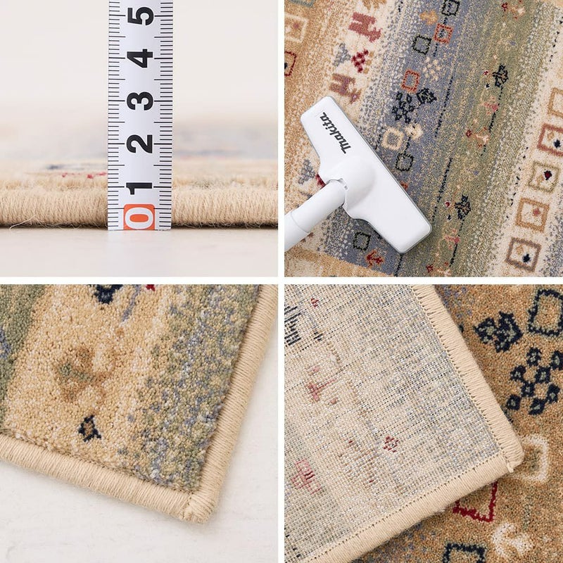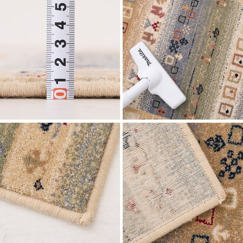 土足で扱うことを前提として作られたウィルトン織りは、パイルの密度が非常に高く、糸同士でしっかりとパイルを締め付けているため耐久性に優れています。また、しっかりと厚みのある上質な仕上がりで、足を乗せても底付き感を感じにくい贅沢な踏み心地が魅力です。