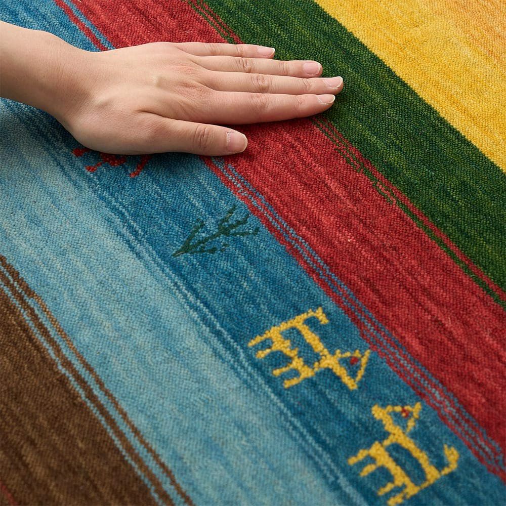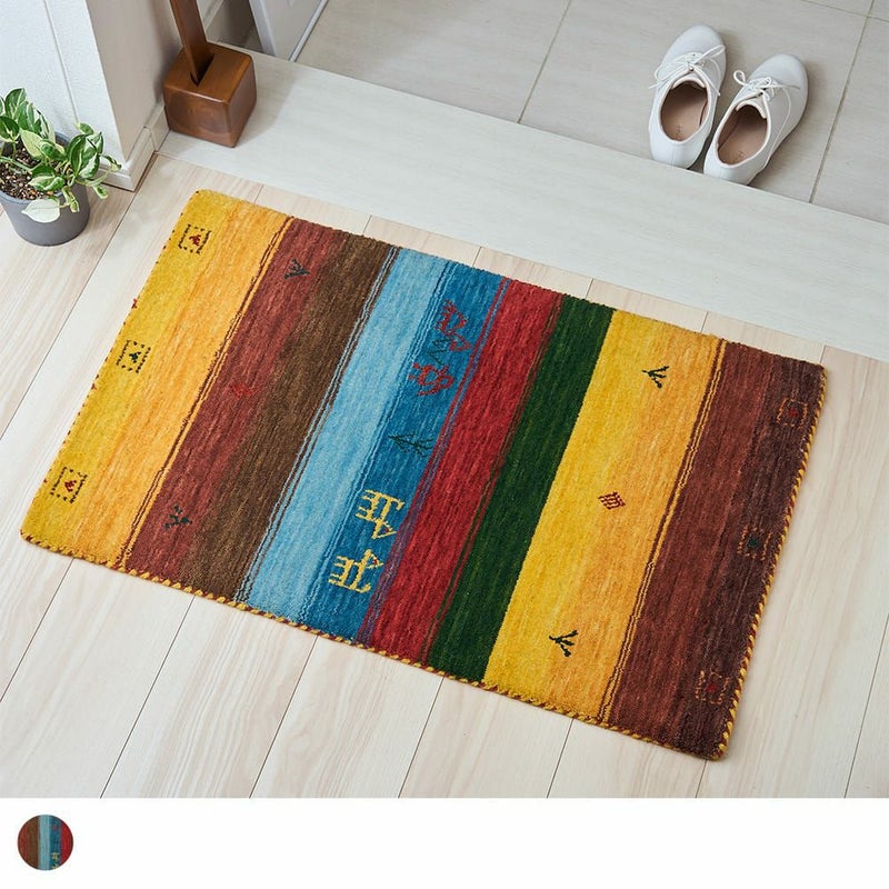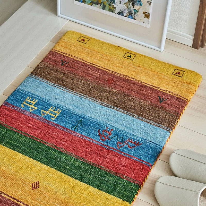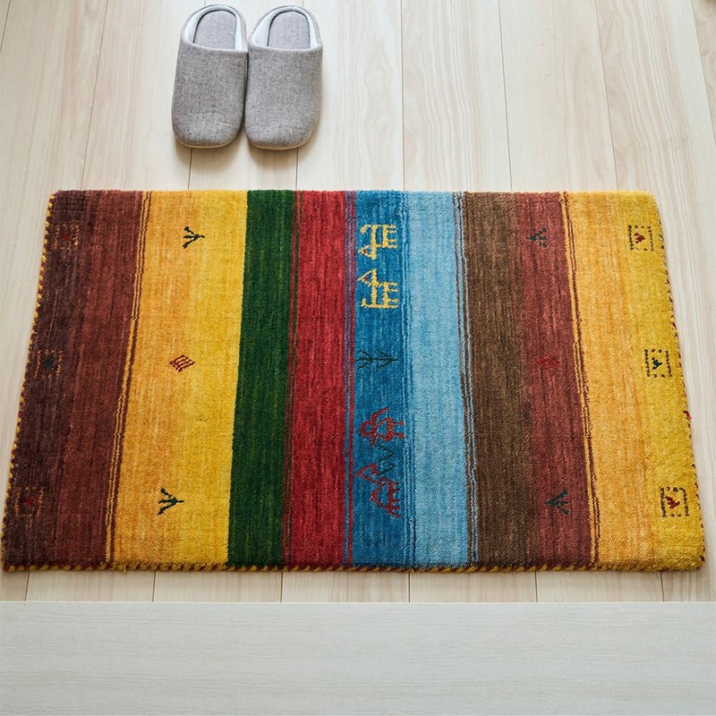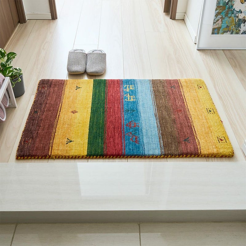 エスニックなカラーリングのストライプが独特な存在感を放つ、ギャッベ柄玄関マット。手織りのインドギャッベならではの素朴な風合いでインテリアに馴染みつつ、その佇まいで空間の主役になってくれること間違いなしの一枚です。