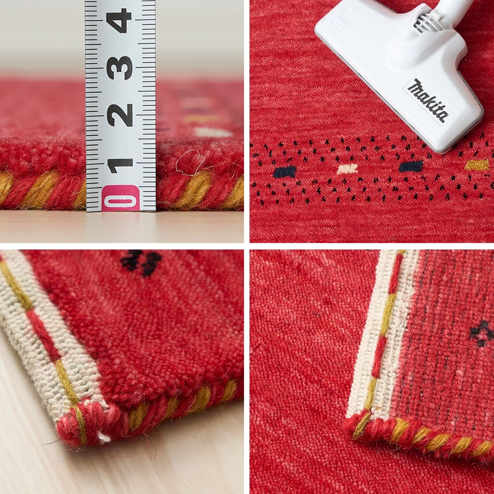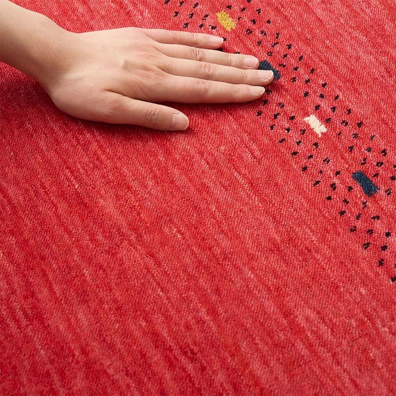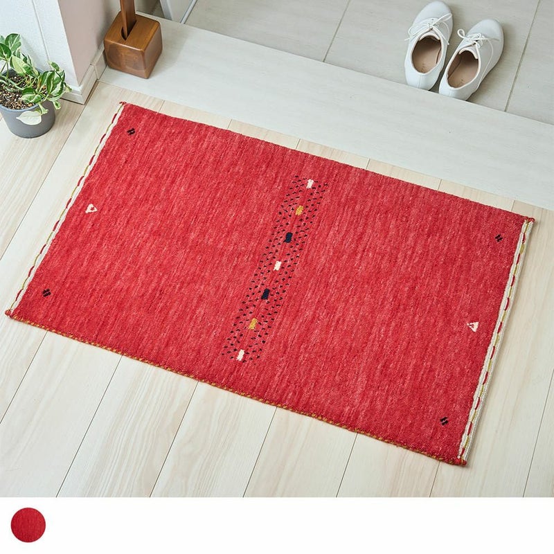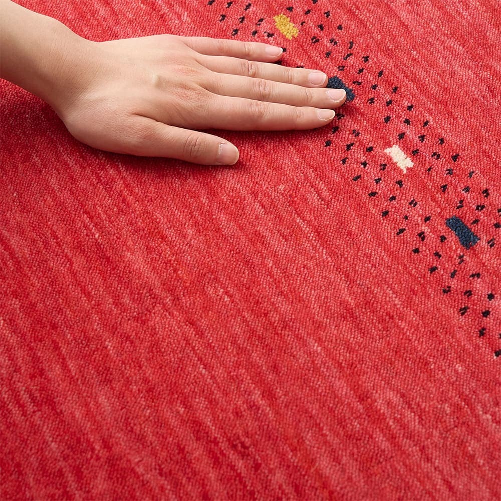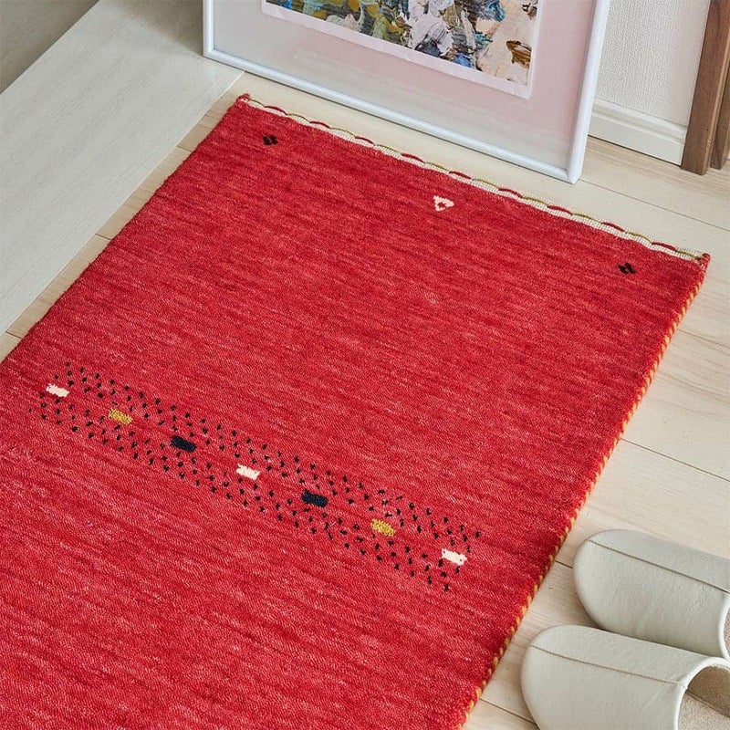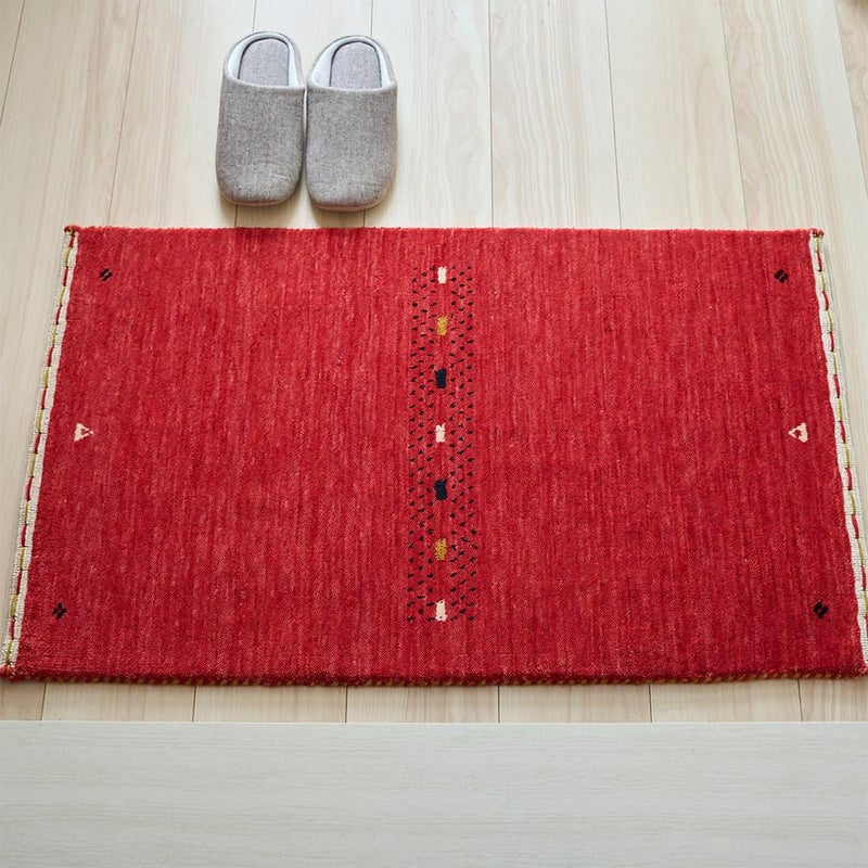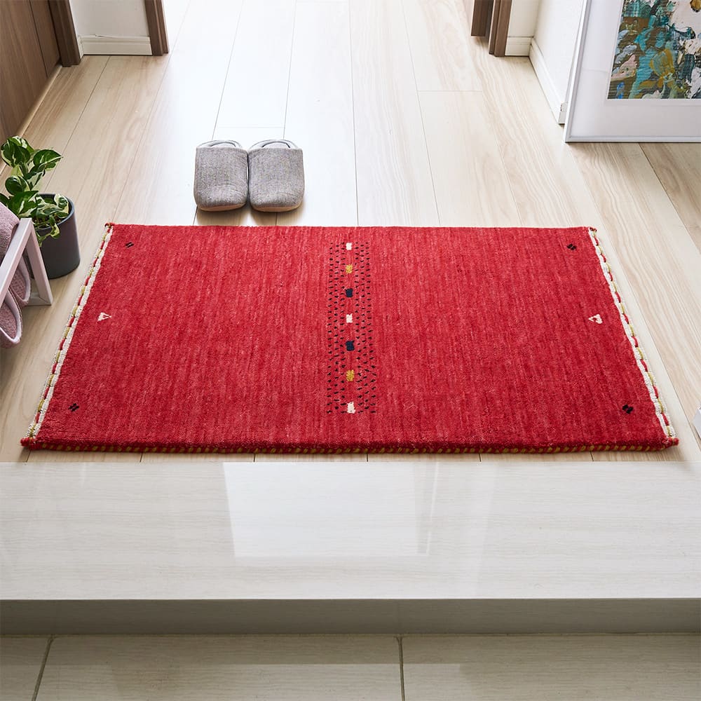 今にも果汁が滴ってきそうな、ジューシーなレッドがかわいいインドギャッベの玄関マット。鮮やかなレッドは空間のアクセントにもピッタリ。使い込むほどに増す上質なウールギャッベの味わいも、存分にお楽しみください。
