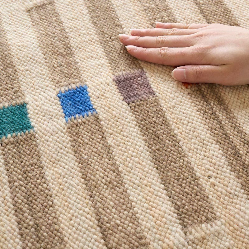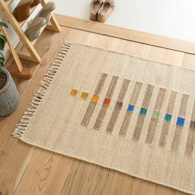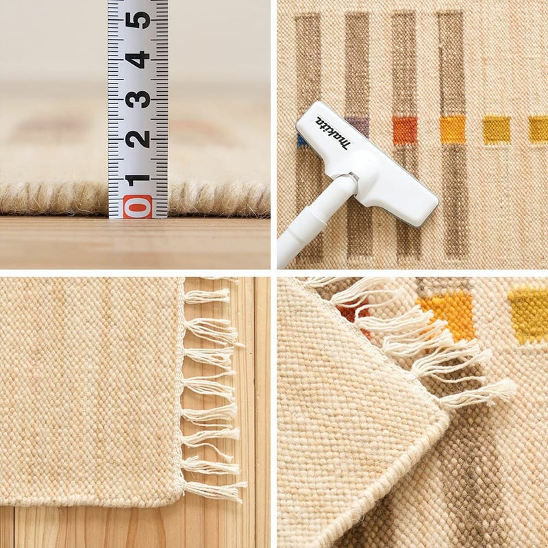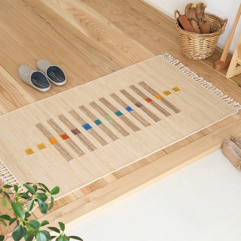 吸湿性のある天然素材のウールで織られているので、湿度の高いジメジメとした夏でもさらりと快適な肌ざわり。また、冬のフローリングの冷たさも防いでくれるので、オールシーズンご愛用いただけます。