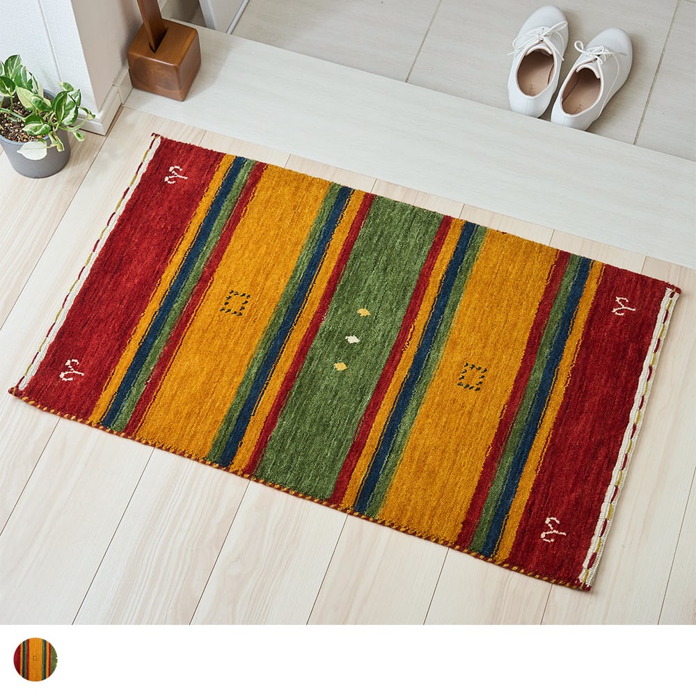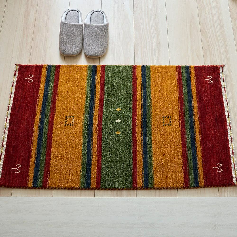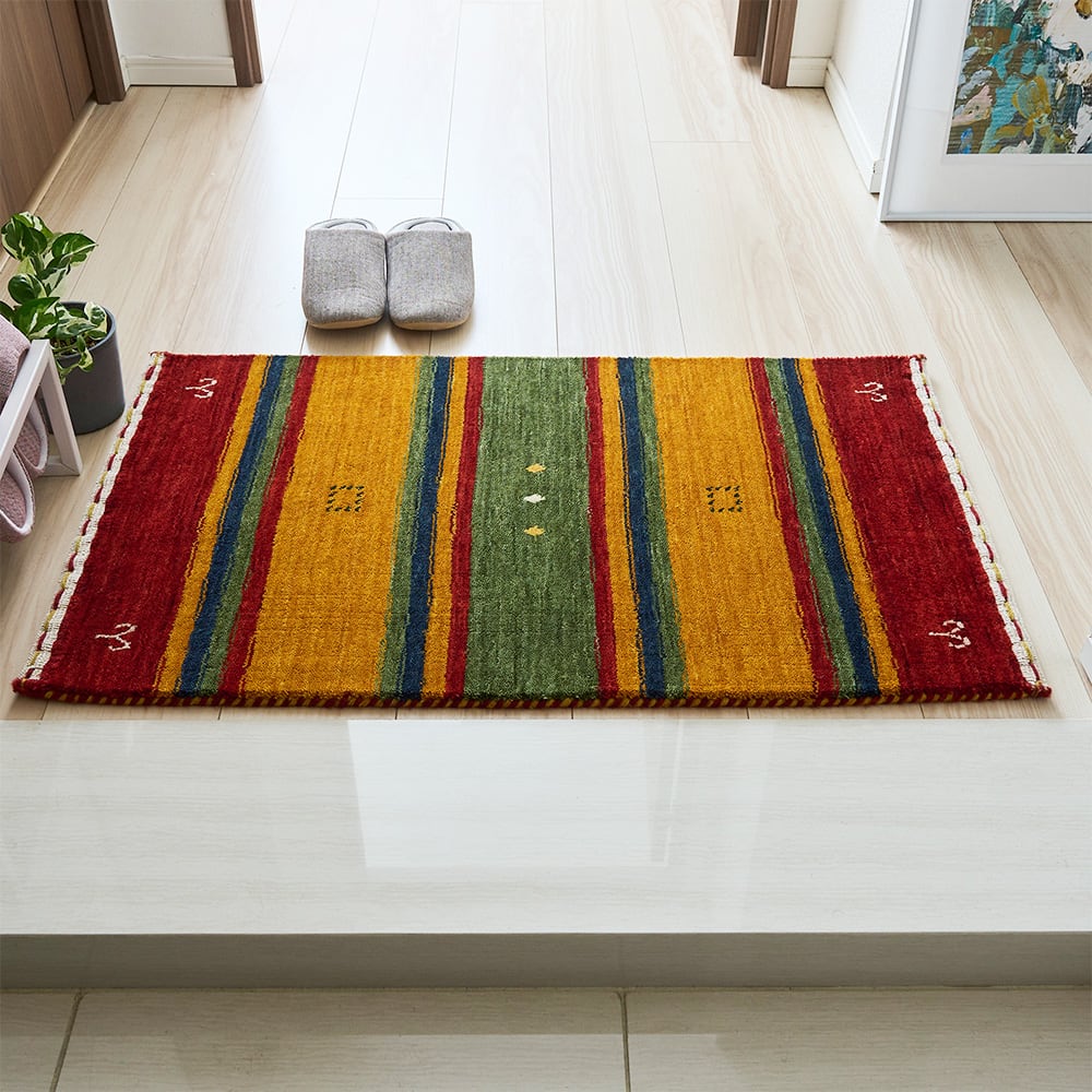 あたたかみのあるエスニックカラーのストライプが、異国を旅している気分にさせてくれるインドギャッベの玄関マット「シル 玄関マット」。手織りで織り上げられたギャッベ特有の味わい深い風合いも楽しめる、こだわりの一枚です。