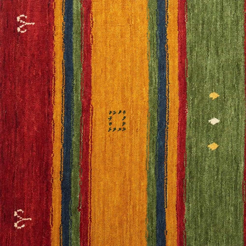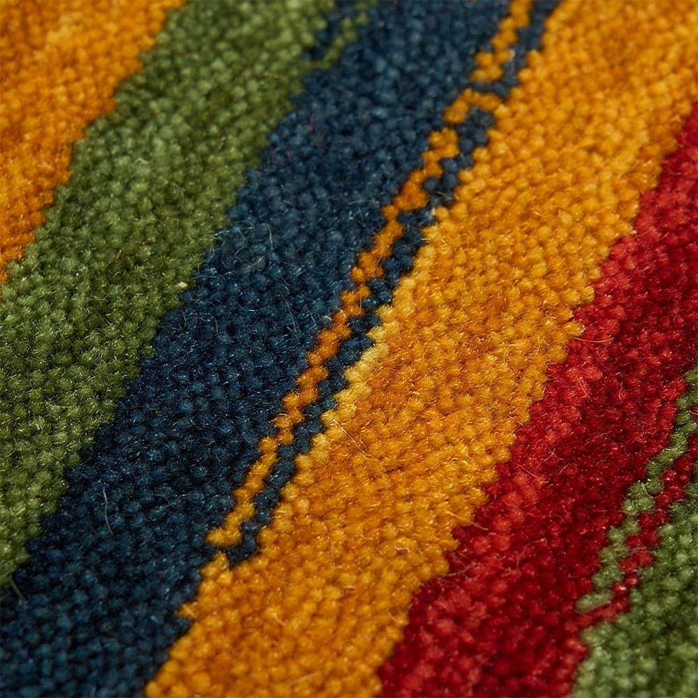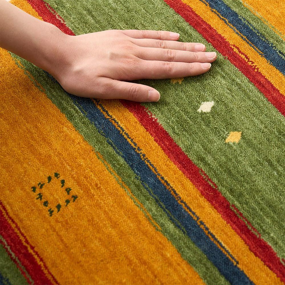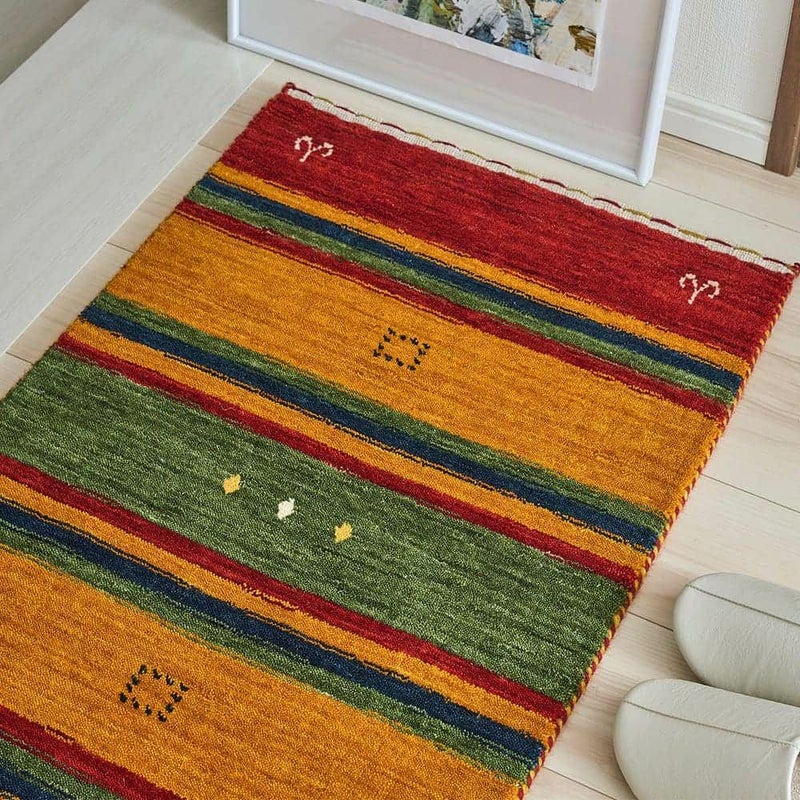 あたたかみのあるエスニックカラーのストライプが、異国を旅している気分にさせてくれるインドギャッベの玄関マット「シル 玄関マット」。手織りで織り上げられたギャッベ特有の味わい深い風合いも楽しめる、こだわりの一枚です。