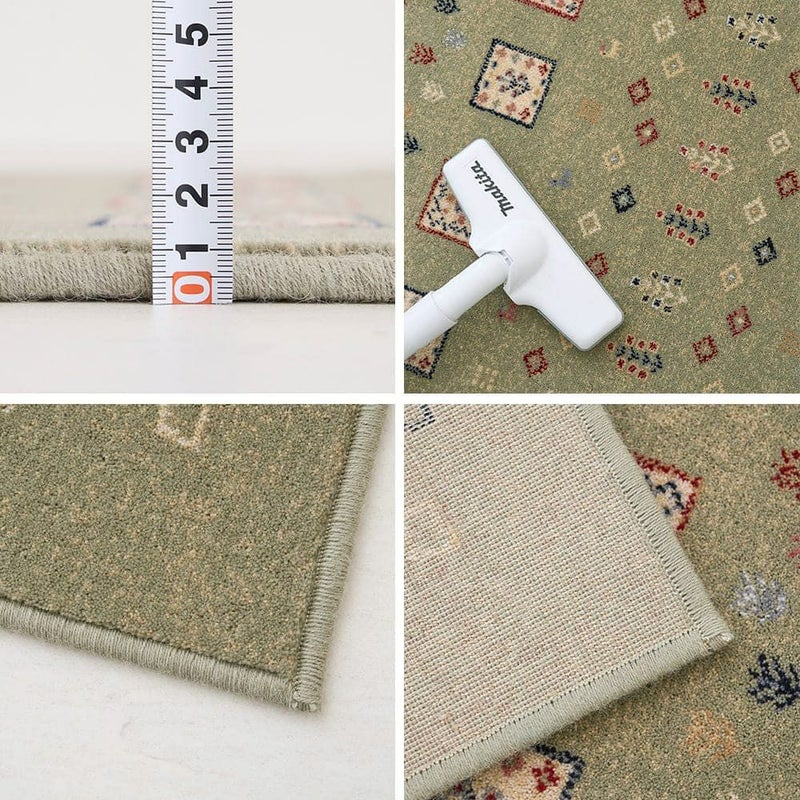 吸湿性のある天然素材のウールで織られているので、湿度の高いジメジメとした夏でもさらりと快適な肌ざわり。また、冬のフローリングの冷たさも防いでくれるので、オールシーズンご愛用いただけます。