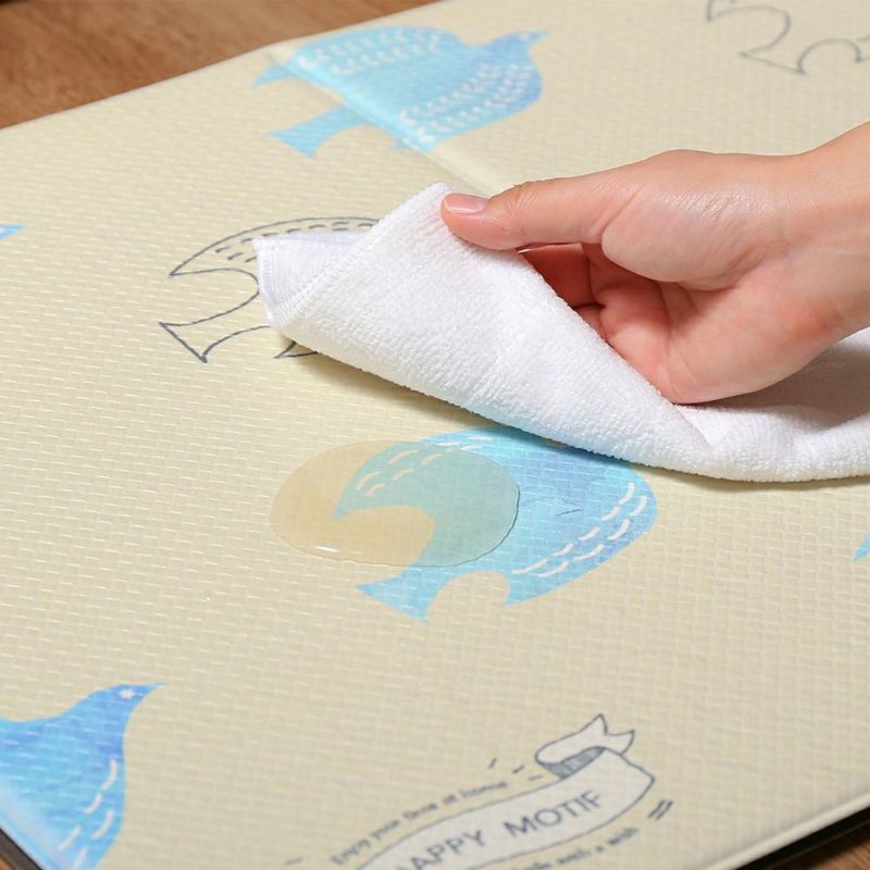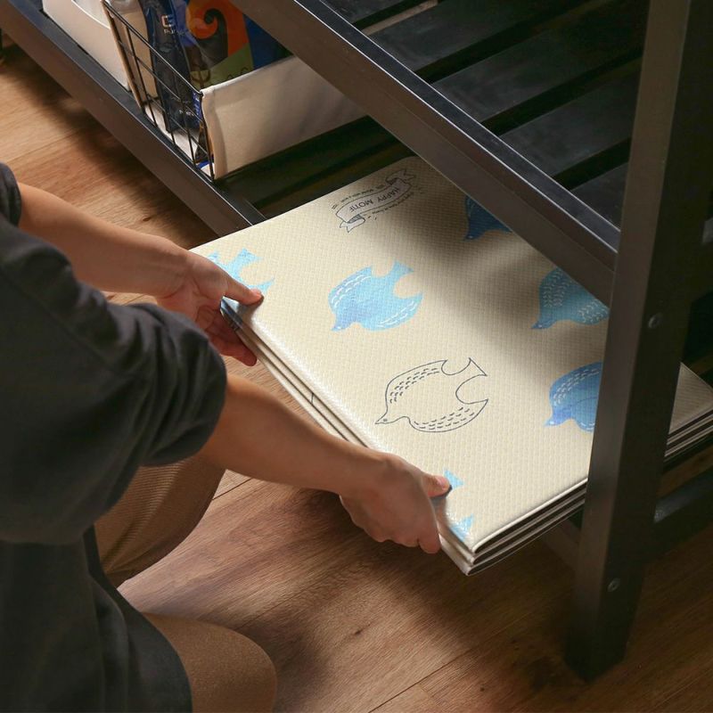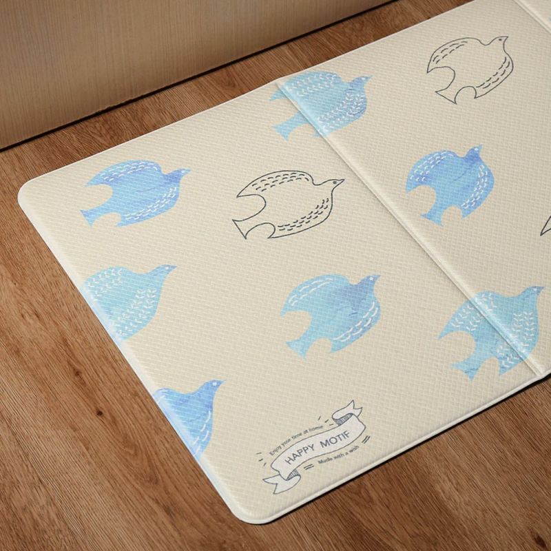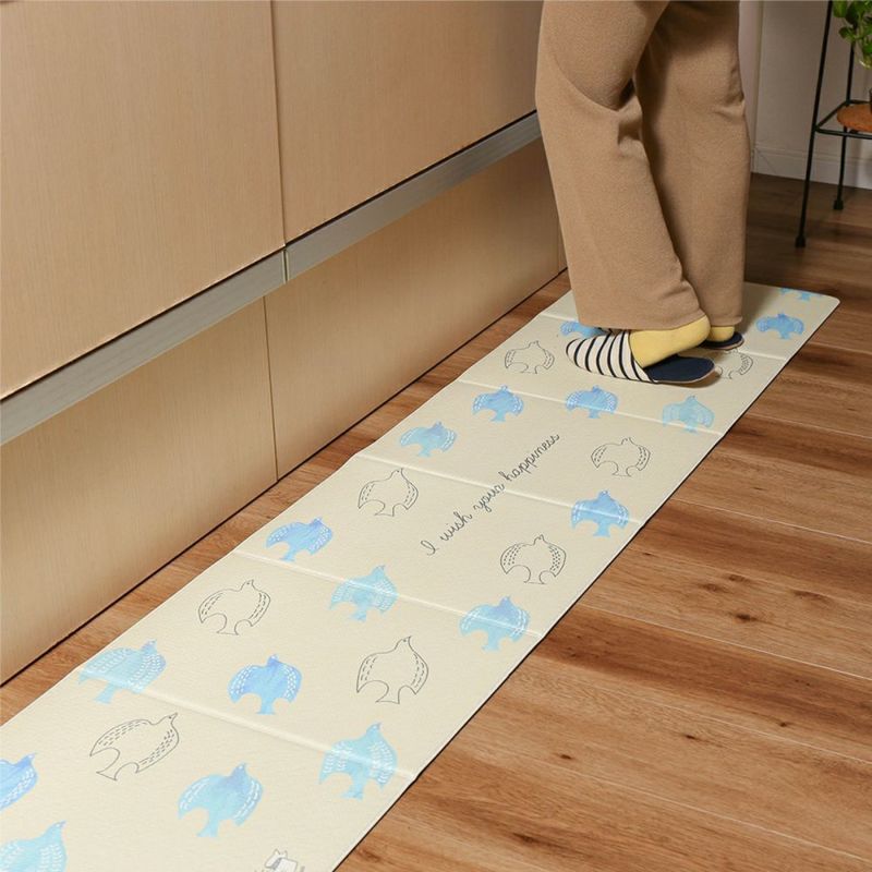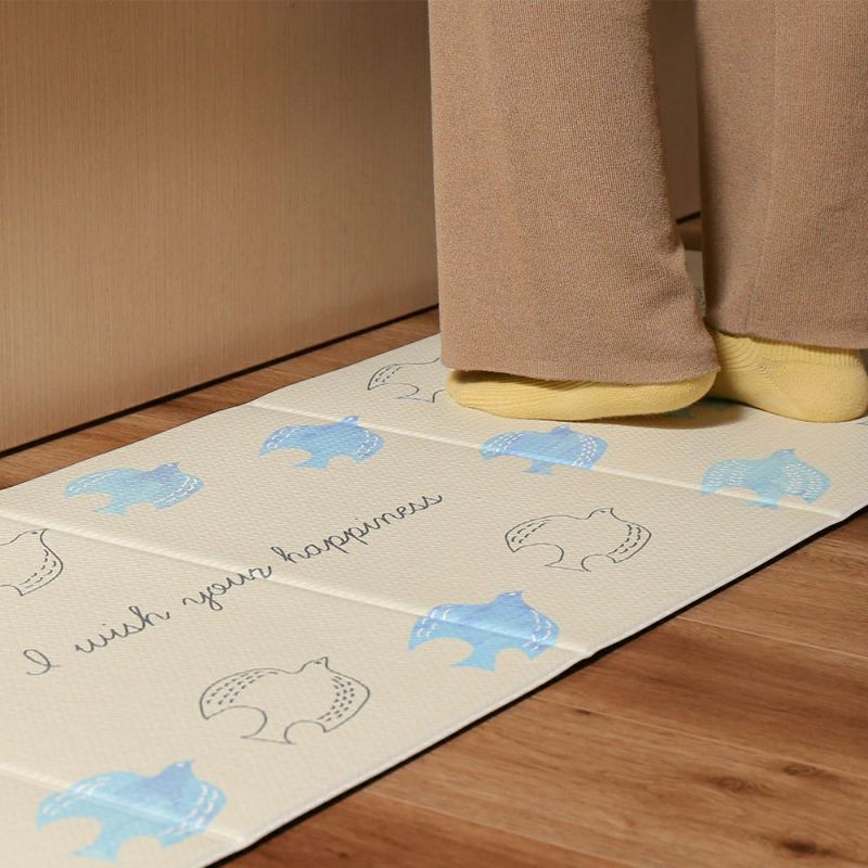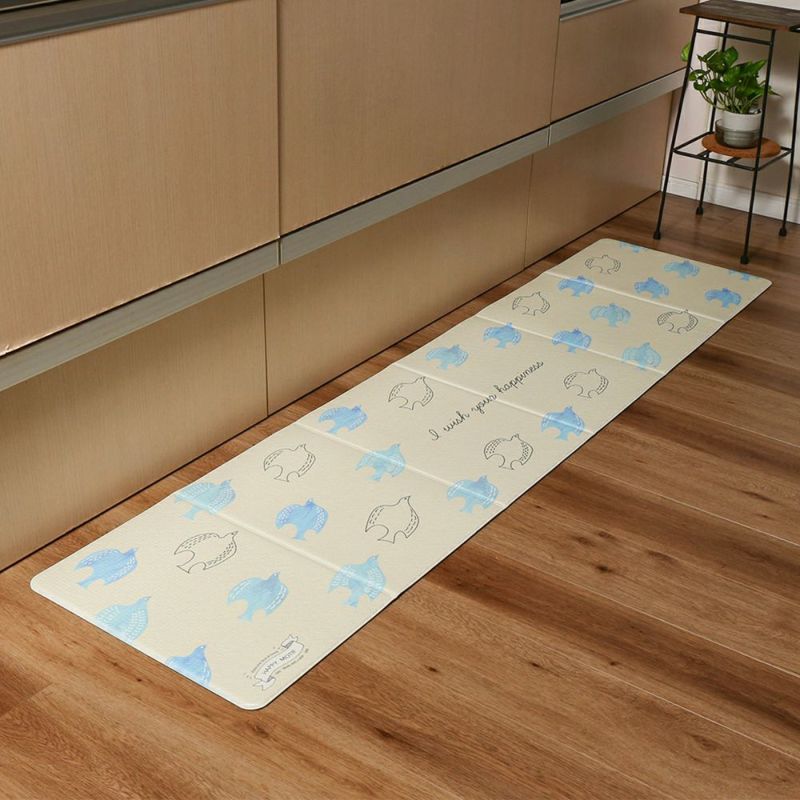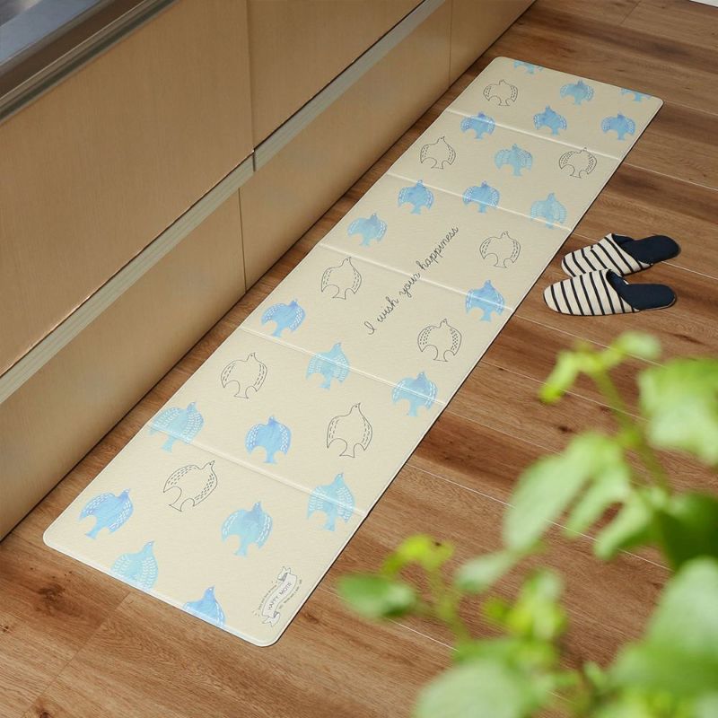 しあわせモチーフの青い鳥が描かれたキッチンマット。折りたためる仕様なので、使わないときにはコンパクトに収納できます。