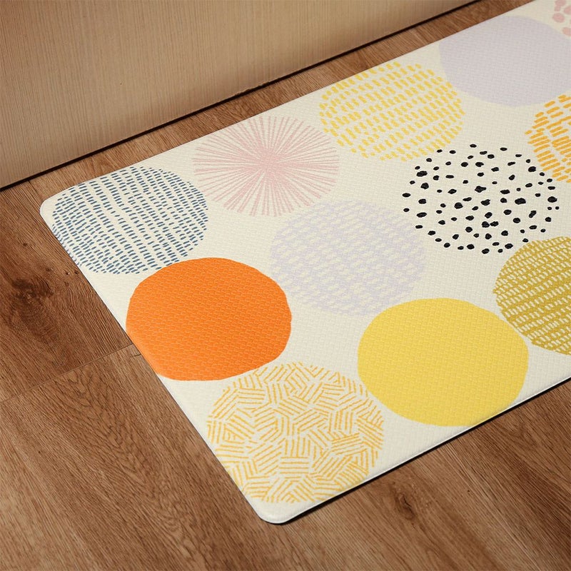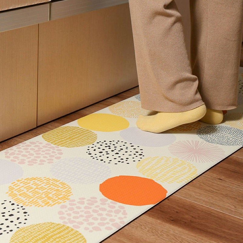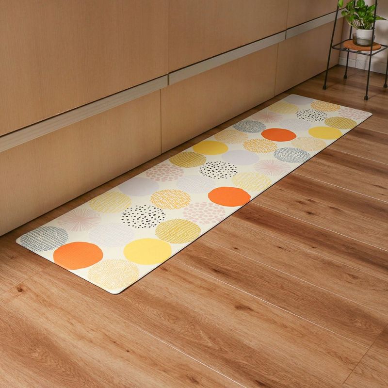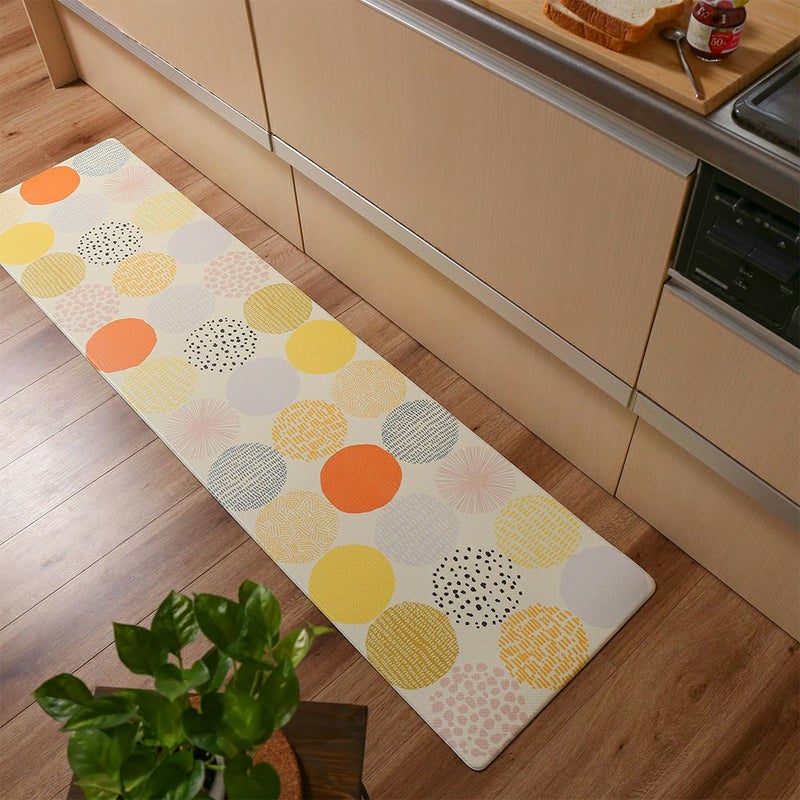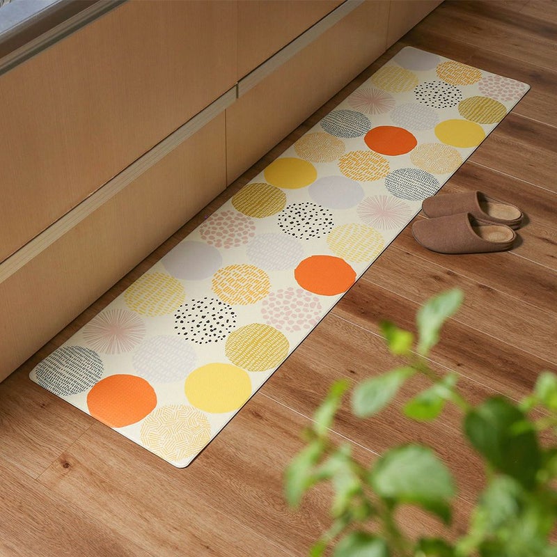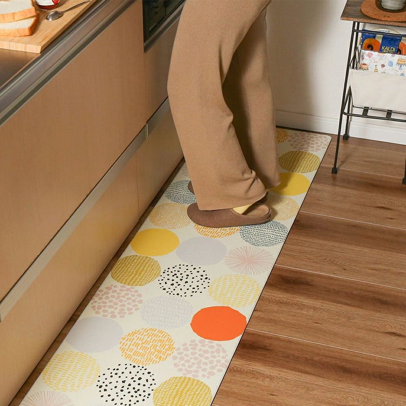 様々な模様のドットが規則的に並んだ、ドット柄のキッチンマット。あたたかみのある配色で敷くだけで北欧インテリアのほっこりするような空間が完成します。