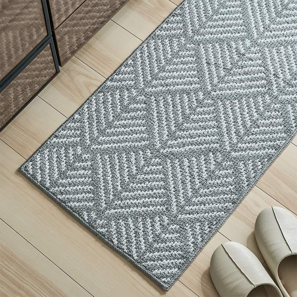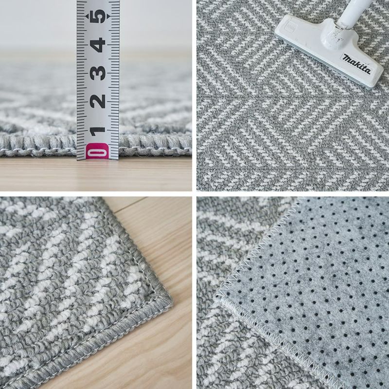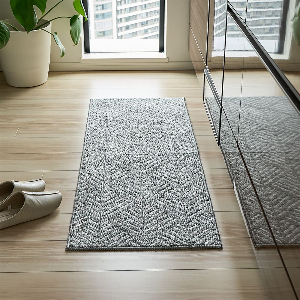洗練されたライトグレーをベースに、スタイリッシュなフィッシュボーン柄がさりげない個性を演出するキッチンマット。足元はいつもサラッと快適。ループ状の毛が毛の間にゴミが入り込みにくく、サッと掃除機をかけるだけでお手入れが完了。洗濯機で丸洗いでき、忙しい時にも嬉しい機能付き。さらに、滑り止め付きで調理中もズレにくく安心。デザインだけでなく、使いやすさも考え抜かれたキッチンマットです。機能的でお洒落なキッチンマットで、あなたのキッチンをより快適な空間にしてみませんか。