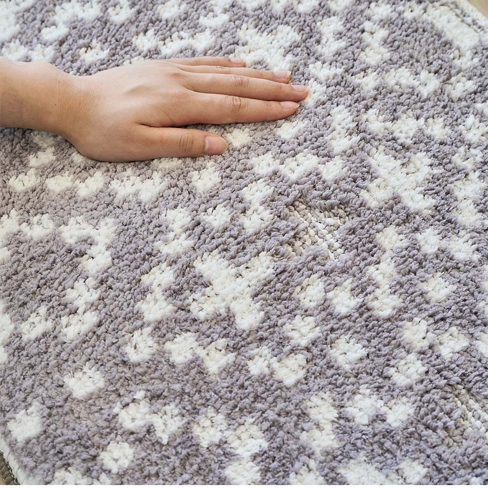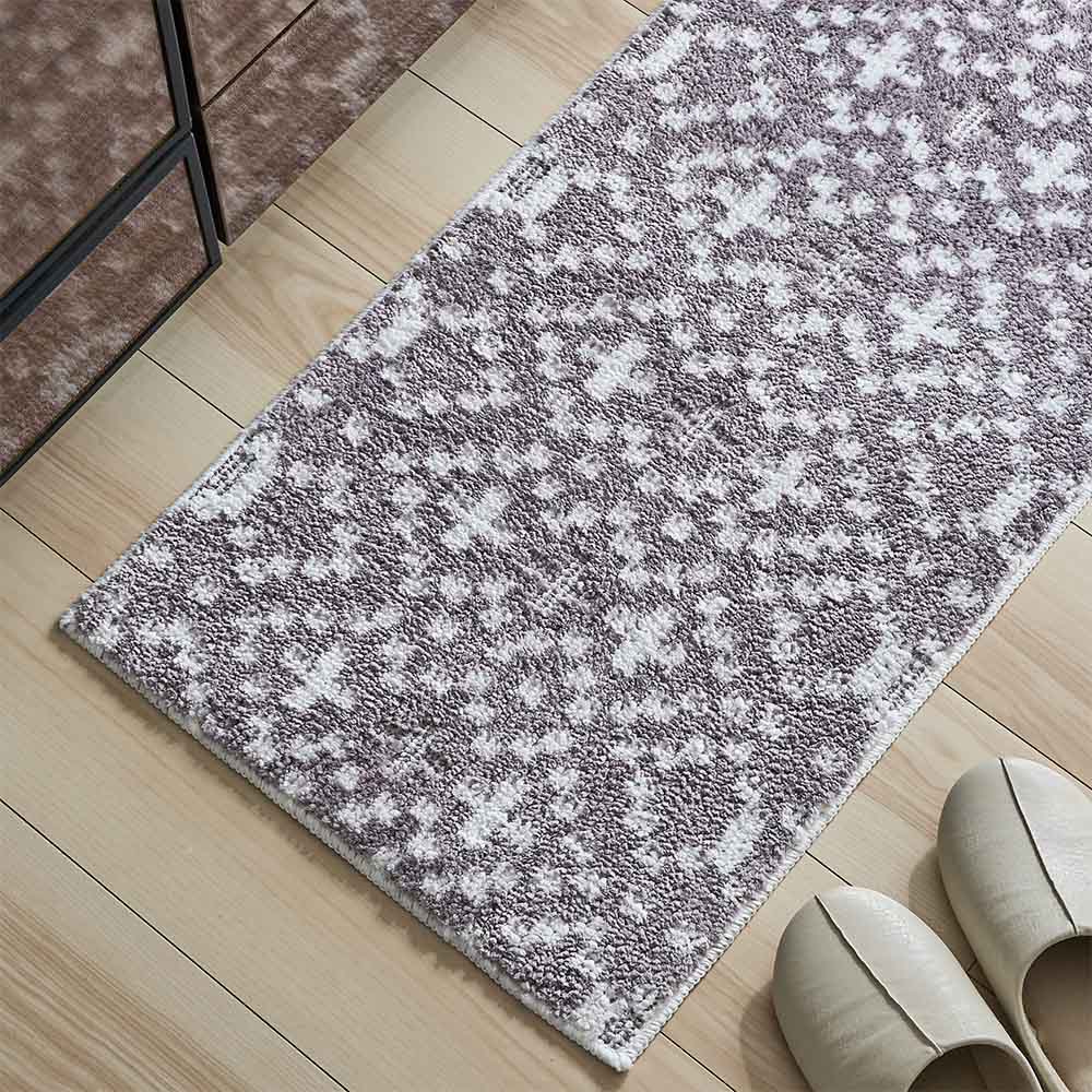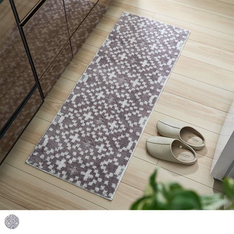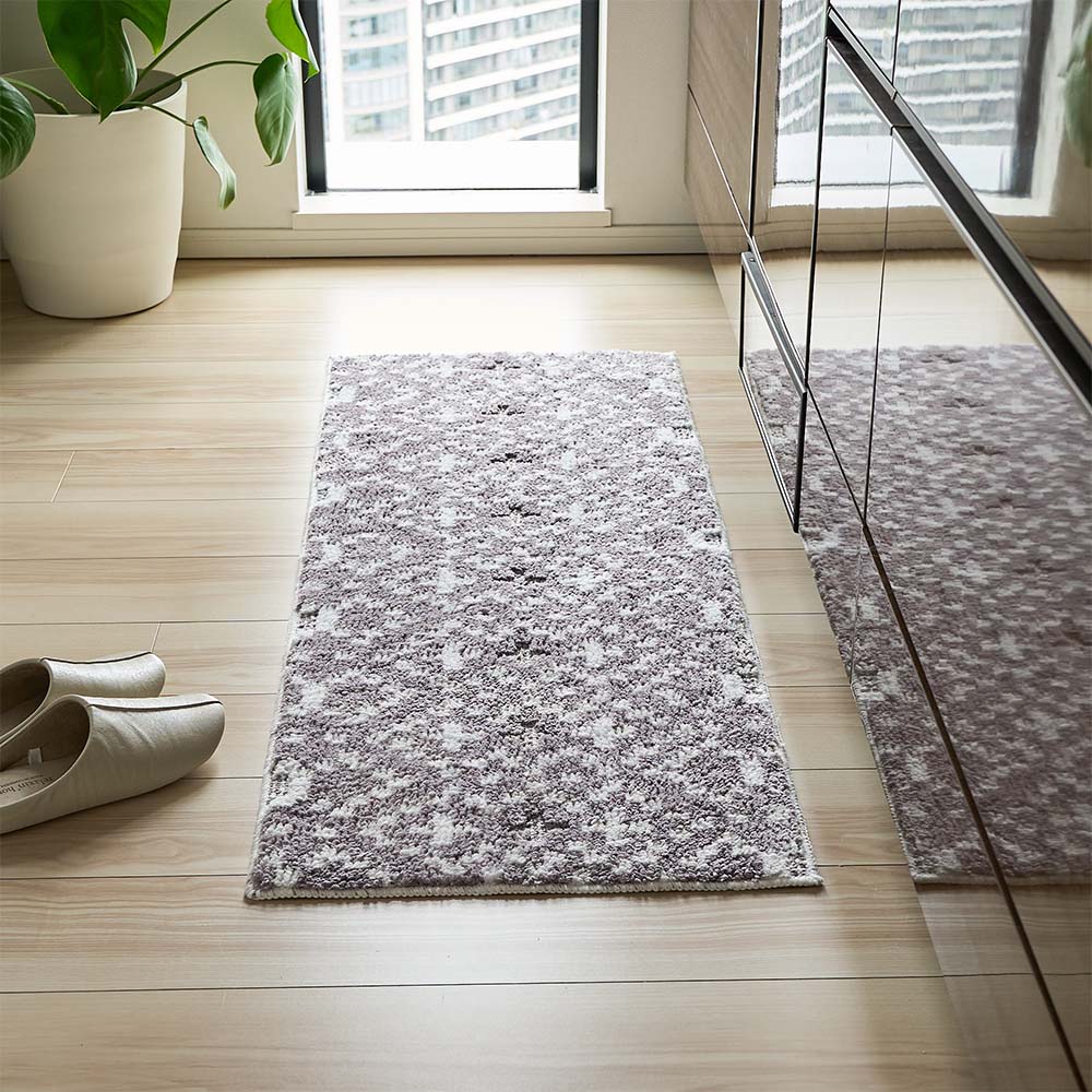 いつものキッチンに、洗練された優しい印象を。ふんわりと優しいグレーをベースに、タイルのようにデザインされた幾何学模様が、モダンながらも温かみのある空間を演出します。また、引き出しやドアの開閉も邪魔しない、程よい毛足の長さも嬉しいポイント。そして、忙しい日々に嬉しい、洗濯機で丸洗いできるお手入れの手軽さ。さらに、滑り止め付きで、お料理中も足元がずれにくく安心です。使いやすさもきちんと考えて作られたキッチンマットとキッチンをもっと心地よく、もっと素敵な空間に変えてみませんか?