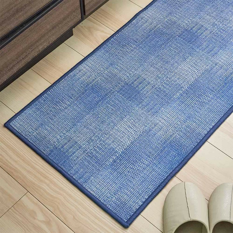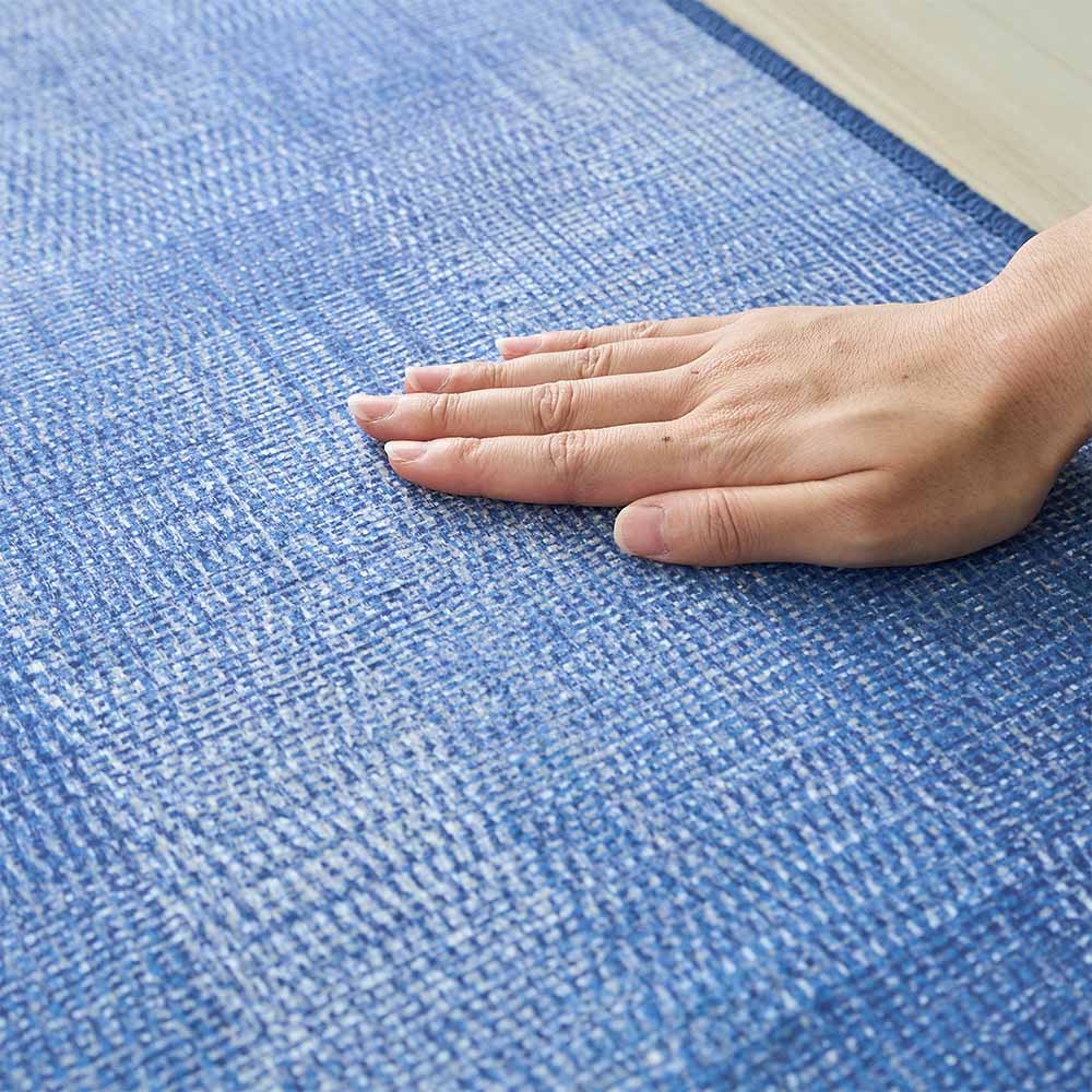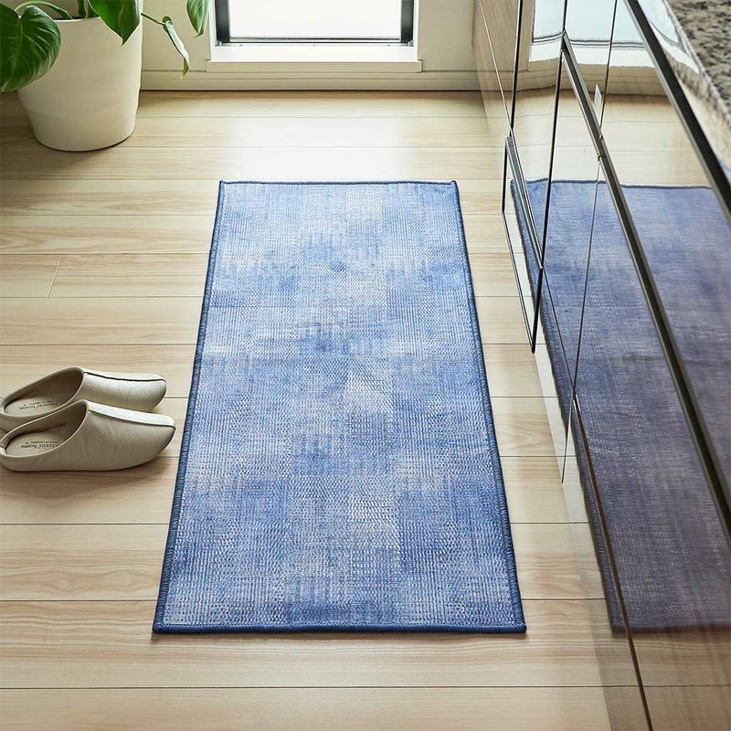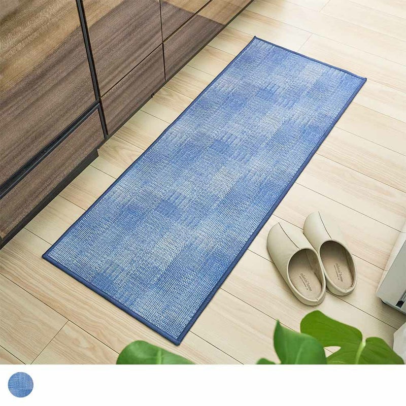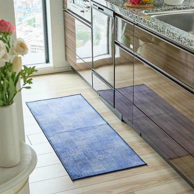 プリントで表現された、繊細な織り模様と深みのあるネイビー色が豊かな表情を与えるキッチンマット。ジーンズのような、さりげない個性が光ります。主張しすぎないその佇まいは、無骨なコンクリートの床はもちろん、温かみのあるウッド素材の床にもしっくりと馴染み、何気ない日常のキッチンに、落ち着いた大人の洗練された印象を添えます。いつものキッチンをさりげなくもセンスの光る空間へとアップデートしてくれるでしょう。