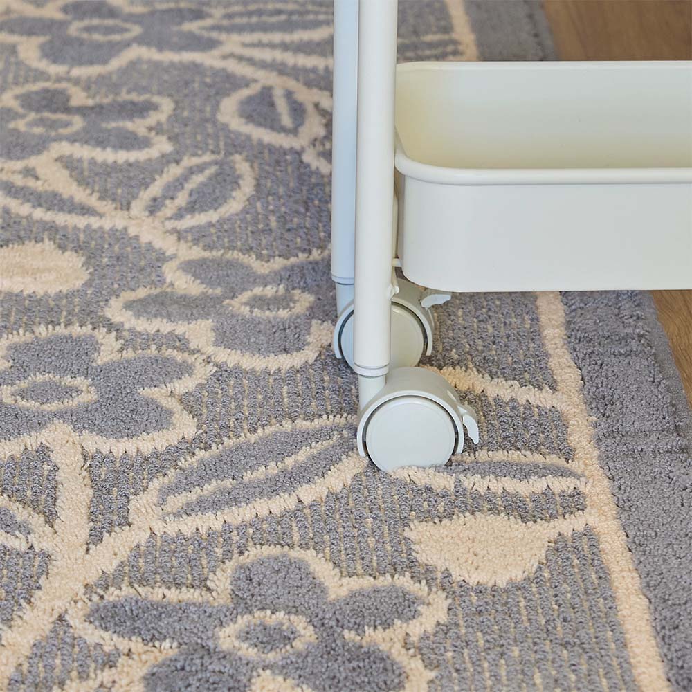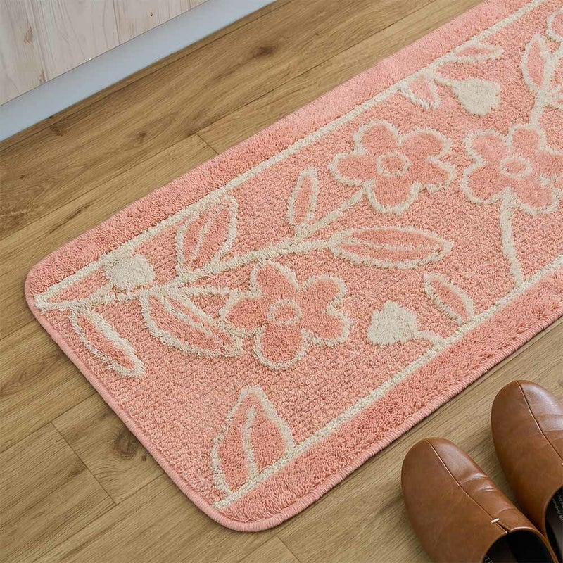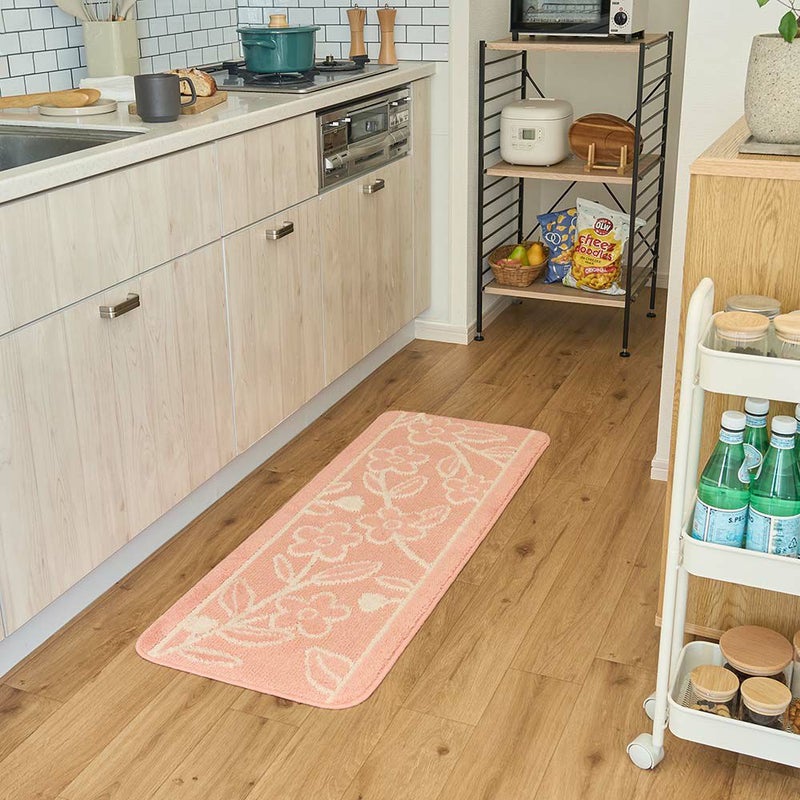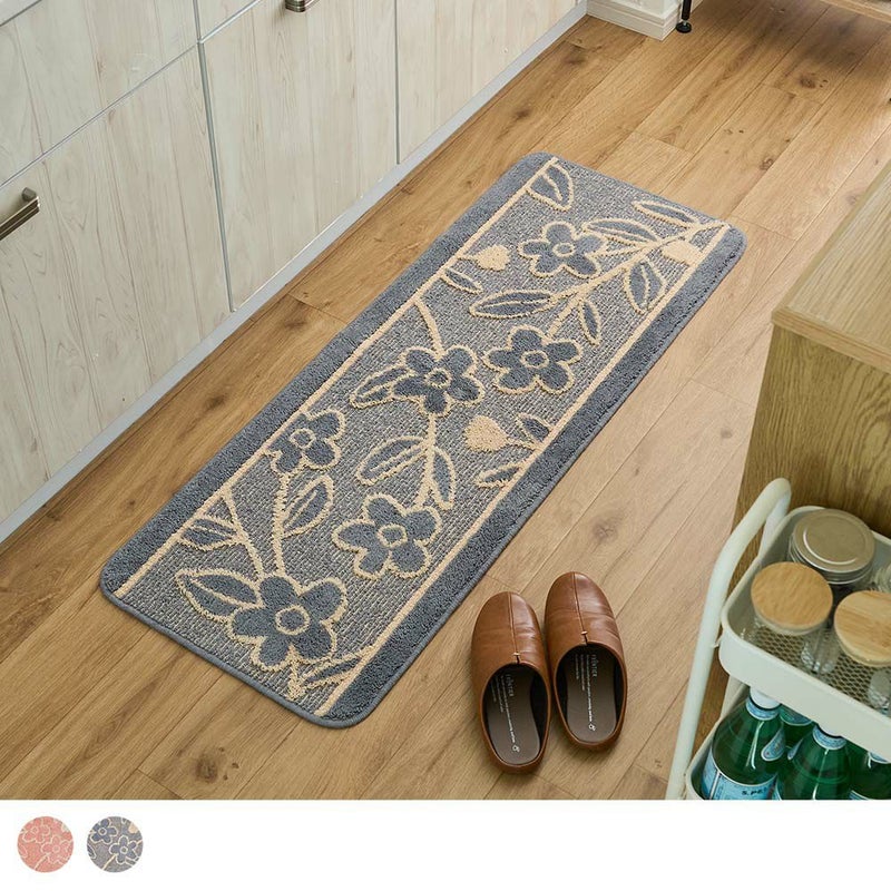 草花モチーフの愛らしいデザインが魅力の「レポ キッチンマット」。無機質になりがちなキッチンも、可愛いデザインでホッと安らげる空間に早変わり!デザインだけでなく、洗濯機で丸洗いできるため、お手入れが簡単なのも魅力の一つ。滑り止め付きで、お料理中に足元がずれにくく安心です。可愛いだけでなく、使いやすさもきちんと考えて作られているキッチンマット。いつものキッチンをもっと心地よく、気分が上がる空間にしませんか?
