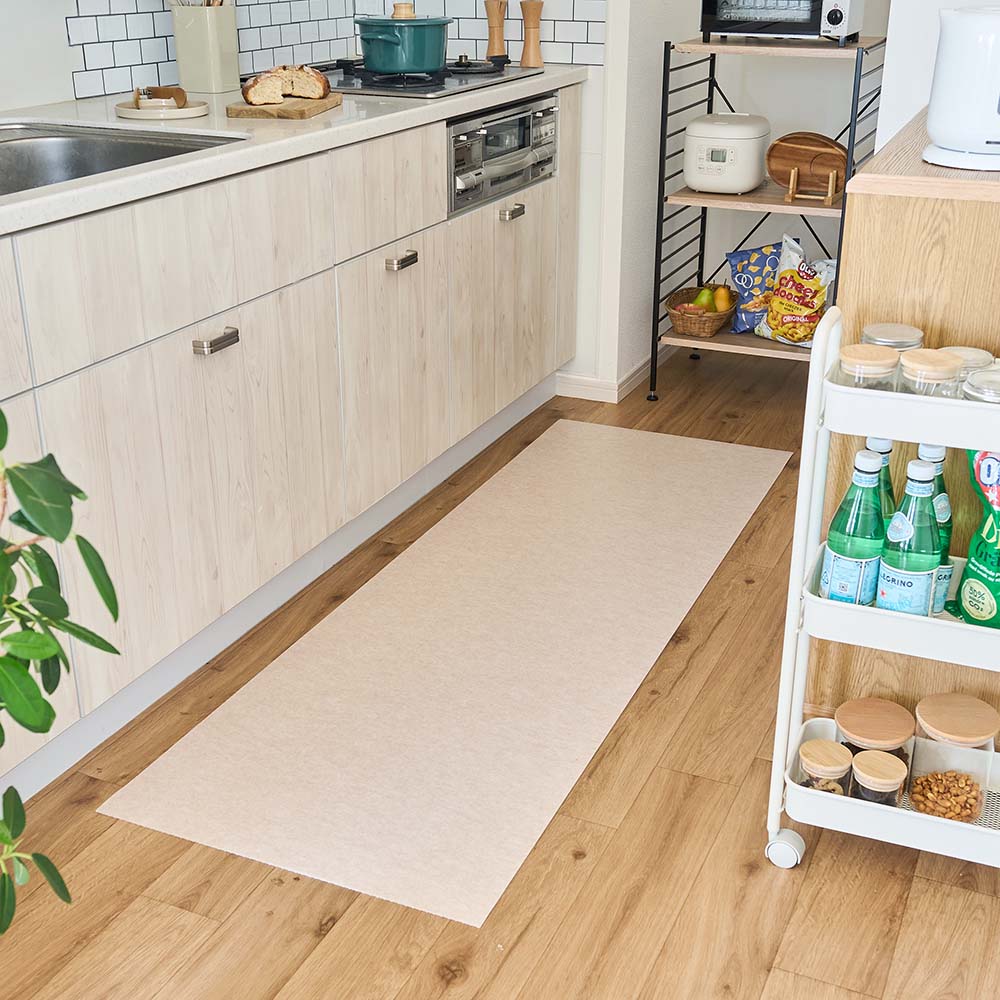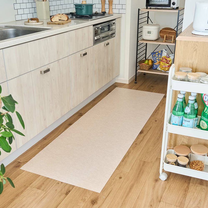 薄手でありながらも、足触りはサラッと快適!「ナチュラン キッチンマット」の大きな魅力は、キッチンスペースに合わせて、ハサミでカットできること!「もう少し幅を狭くしたいな」といったあなたの願いを実現します。さらに、毎日のお手入れの負担を軽減する、はっ水機能!うっかり水をこぼしても、サッと拭き取るだけでシミになる心配がありません。油汚れなども染み込みにくく、清潔な状態を簡単にキープできます◎足元が変われば、キッチンが変わる!「ナチュラン キッチンマット」と、もっと快適な調理時間にしませんか?