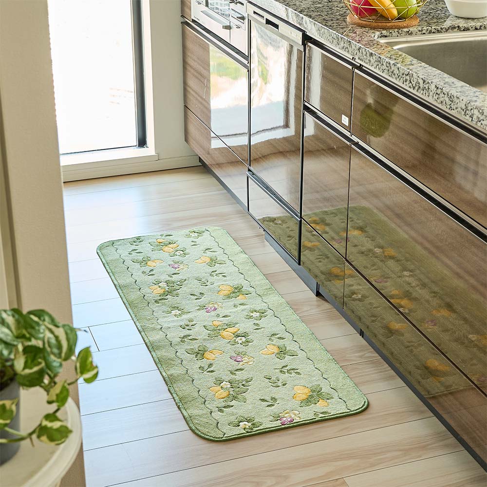 フレッシュさ漂うレモンと葉のモチーフが、エレガントな雰囲気を漂わせる「プロヴァンス キッチンマット」。爽やかなカラーリングが、暗くなりがちなキッチン空間をより明るく華やかに彩ります。さらに、気になるニオイや雑菌の繁殖を抑える抗菌・防臭効果をプラス。いつでも気持ちよくお使いいただけます。使いやすさはもちろん、見た目の美しさにもこだわり、あなたのキッチンをもっと心地よく、もっと素敵な空間に変えてくれます。足元から広がるエレガンスで、いつもの家事の時間をより充実させてみませんか。