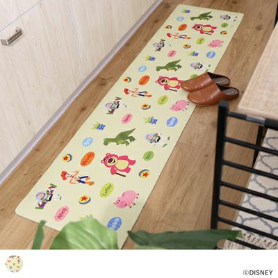 トイ・ストーリーデザインをユーモアなタッチで描いたキッチンマット。アイキャッチな総柄デザインが遊び心満点です。お手入れが時短できるPVC素材も魅力的〇