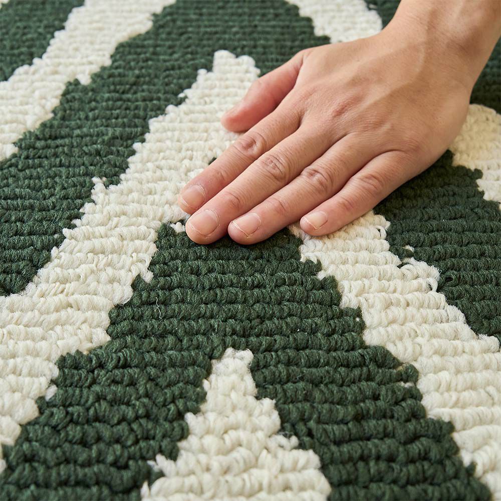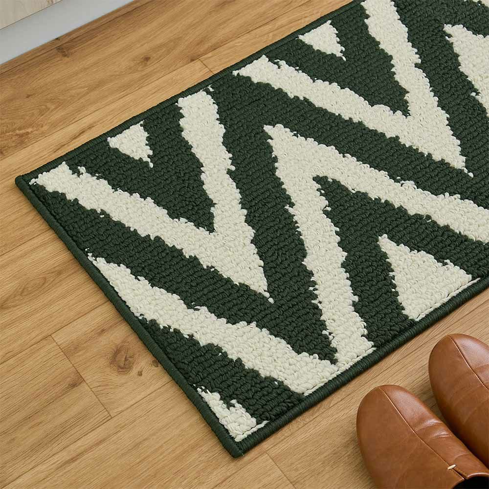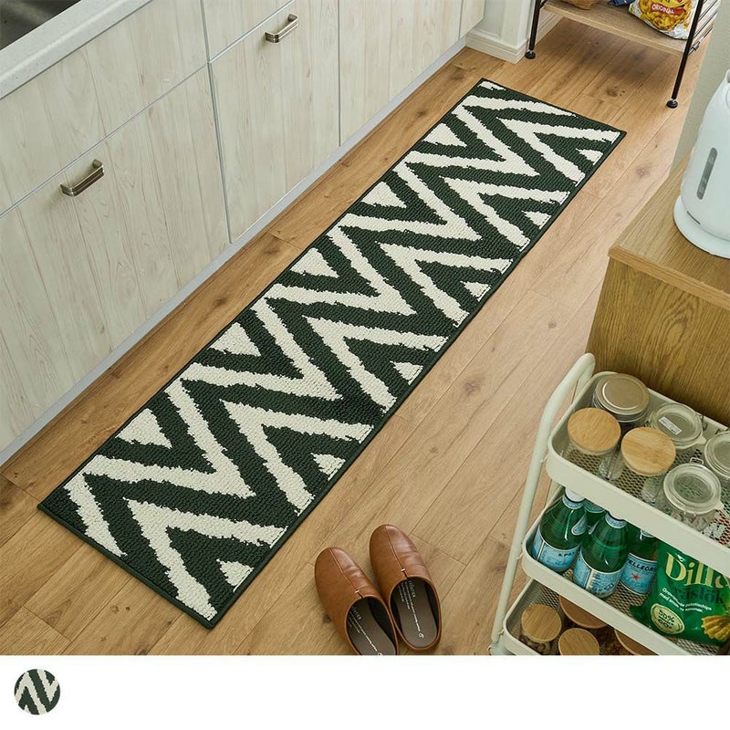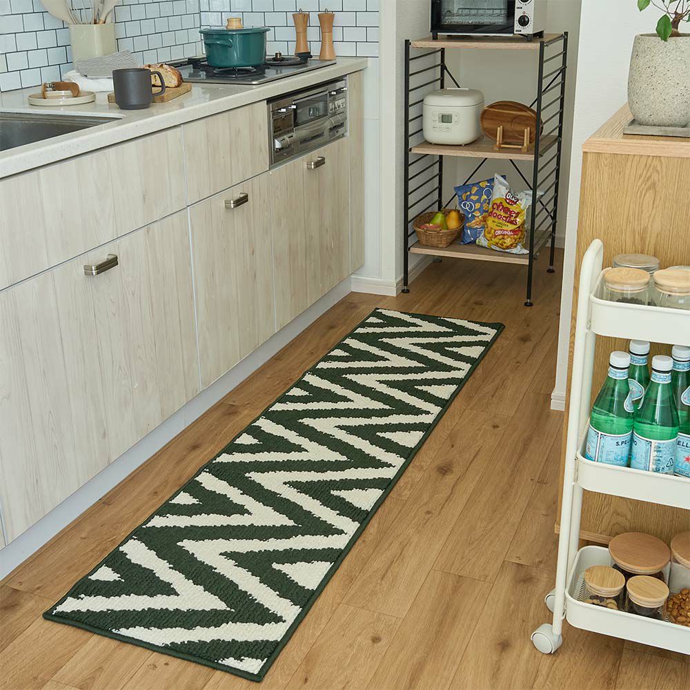 物足りなさを感じていたキッチンに、カッコいいアクセントを。「ベイク キッチンマット」は、アイボリーと深いグリーンのシェブロン柄が、キッチンをよりモダンな雰囲気に変えてくれます。シンプルながらも存在感のあるデザインが、あなたのセンスを際立たせてくれる一枚です。機能性も抜群で、うっかり汚してしまっても手洗いできるからいつでも清潔。裏面には滑りにくいゴム加工で、安全性もばっちり。「ベイク キッチンマット」で、あなたのキッチンを今よりもっと自分らしい空間にしませんか?