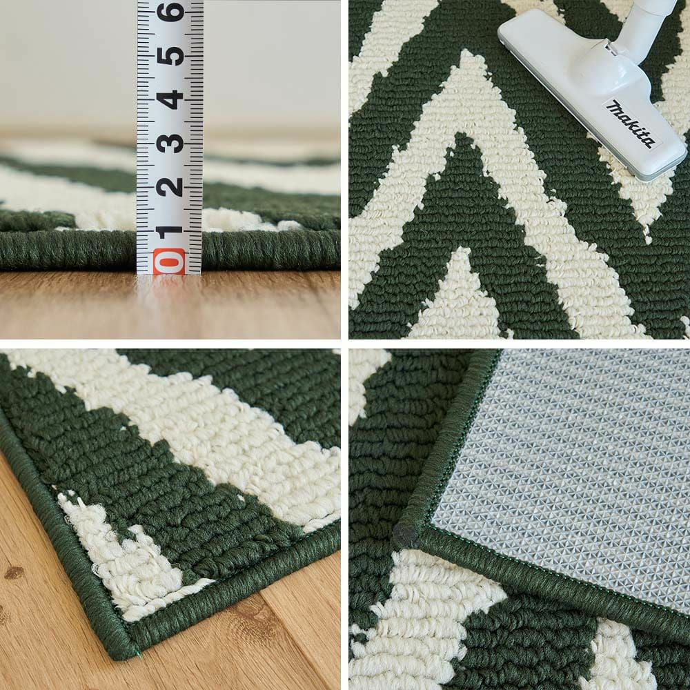 ループ状の毛は毛の間にゴミが入り込みにくく、サッと掃除機をかけるだけでも簡単清潔に。さらに、裏面には滑りにくいゴム加工で調理中もずれにくく安心。足元を見落としがちな調理中に嬉しい機能です。