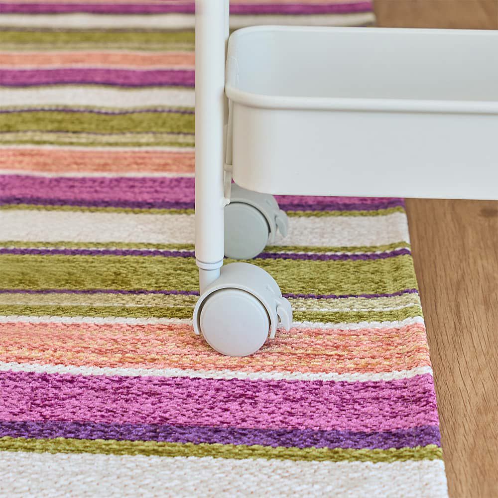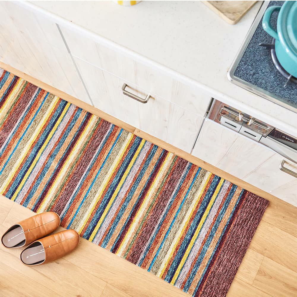 プリントタイプのマットに比べて色落ちがしにくく、鮮やかに染め上げた先染めタイプ。だから何度も洗いたいキッチンマットでも、お気に入りのカラーが長く続きます。