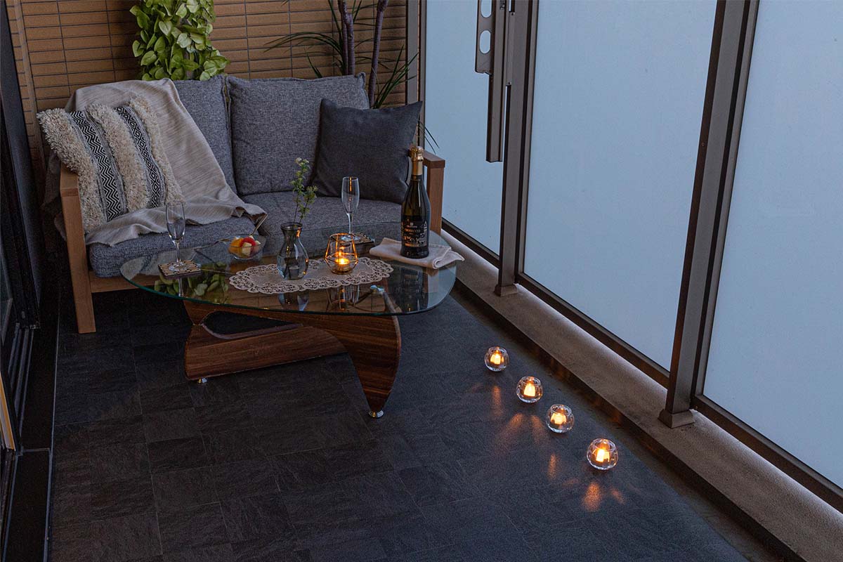 ブラックをベースにしたコーディネートで、まるでホテルのテラスのようなリッチな雰囲気を演出。ホテルラウンジやオープンテラスを自宅のベランダで再現できます。外の空気を感じながら飲むお酒は格別です。