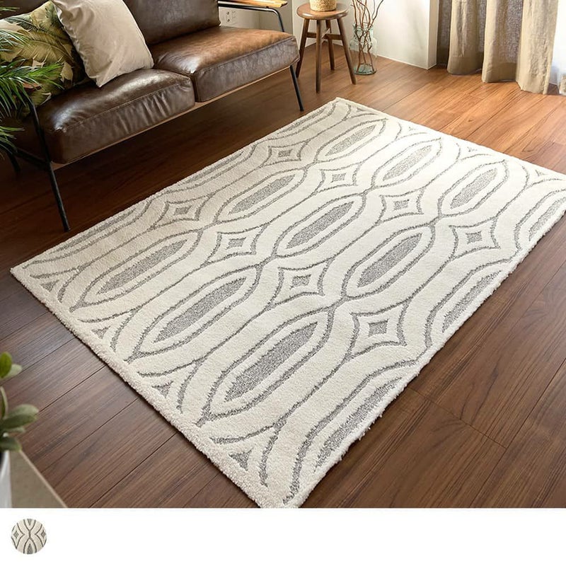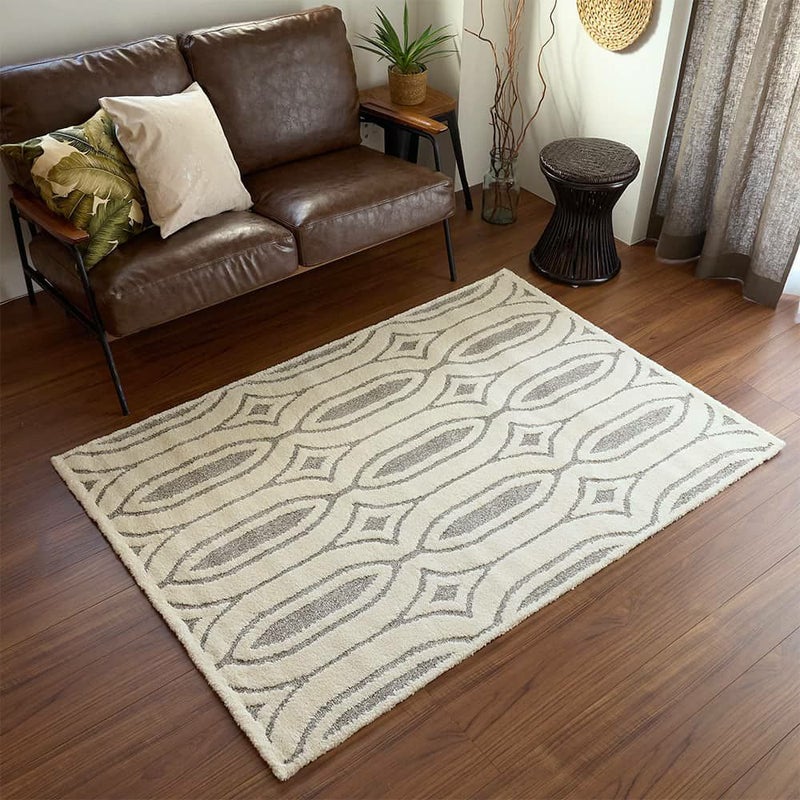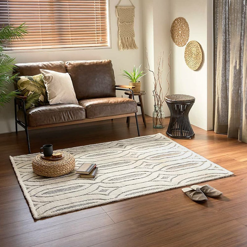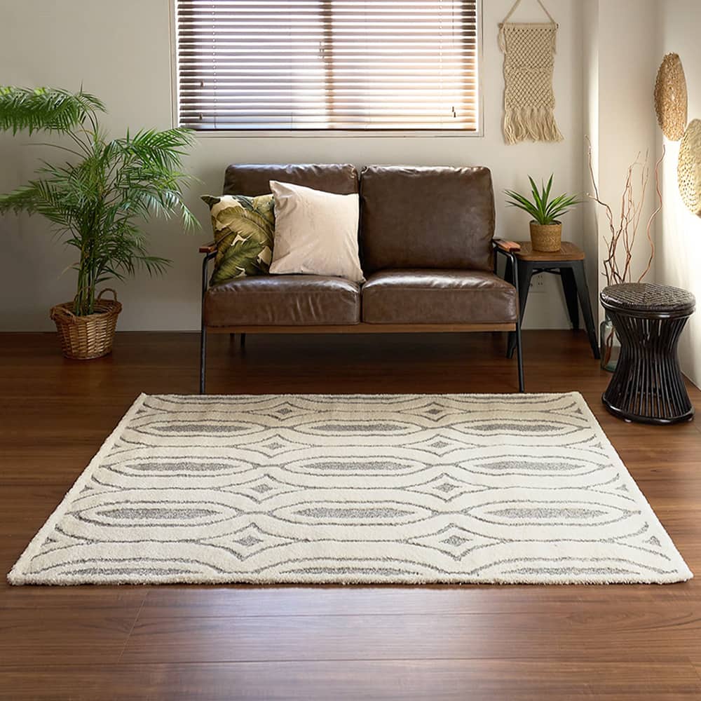 インパクトがあるデザインながらも、ニュアンスのあるグレー×アイボリーでまとめた配色は高級感が漂います。ナチュラルモダンなアフリカンスタイルのクオリティを上げる、こだわりのラグです。