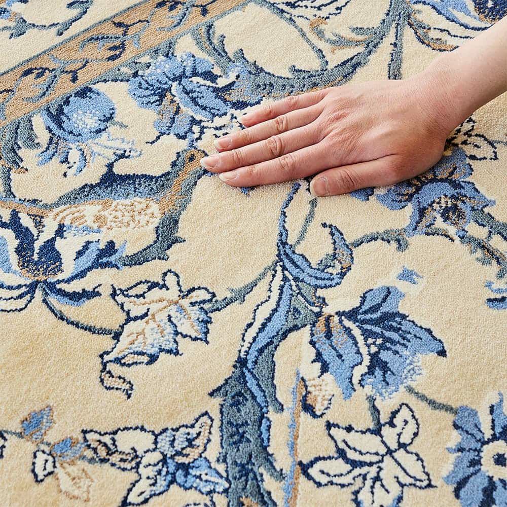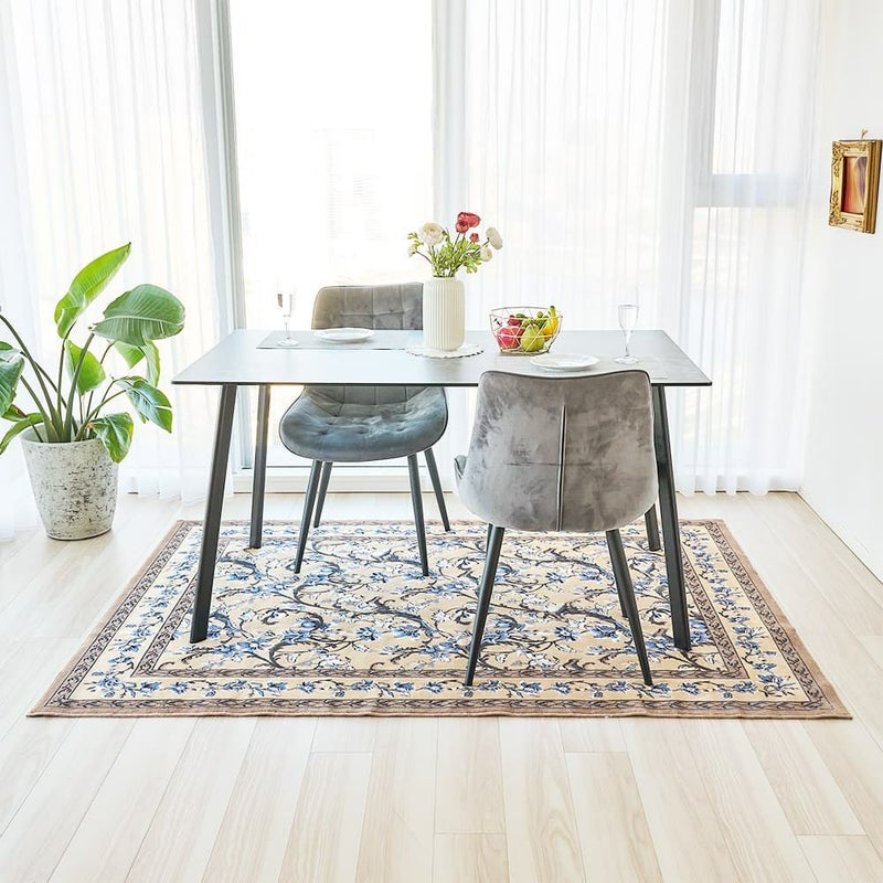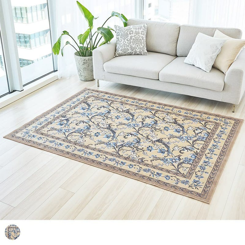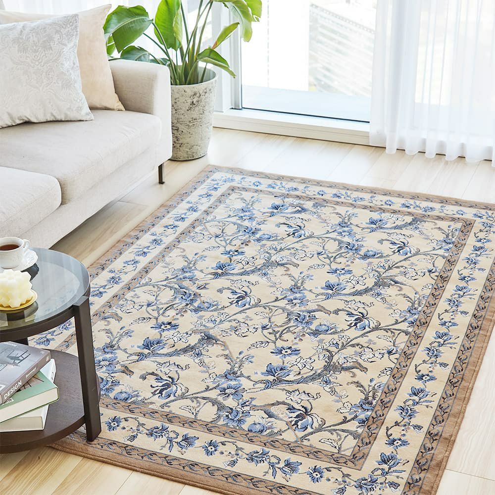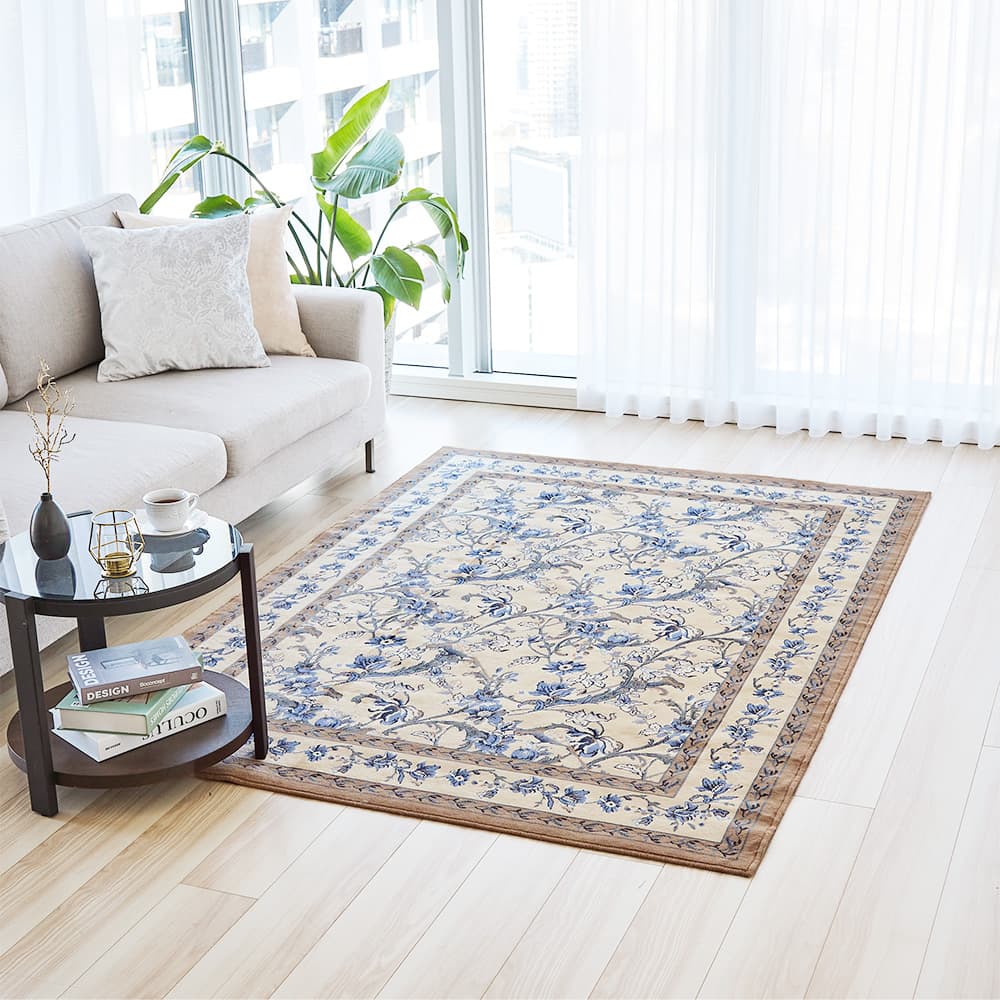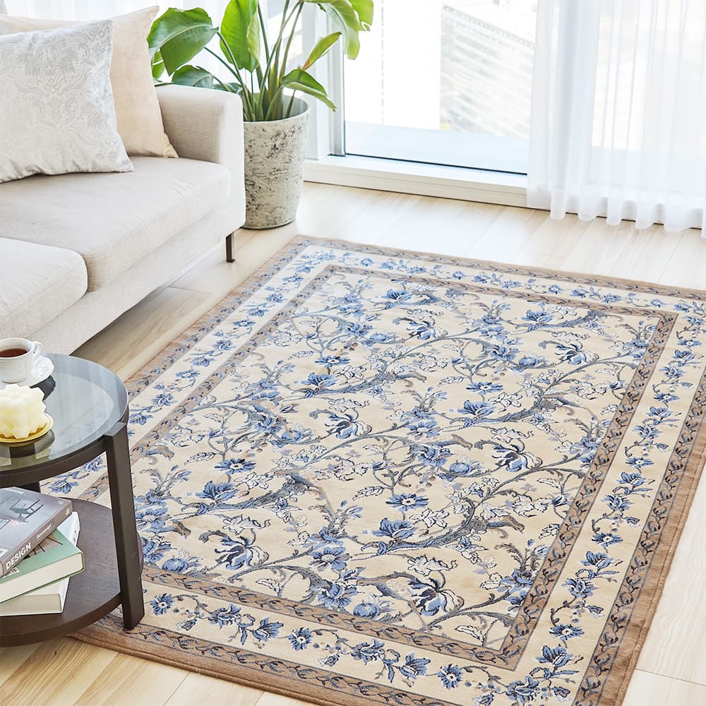 ヨーロッパ風のアンティークなボタニカル柄が、お部屋を一気に格式高い雰囲気に。一枚敷くだけで空間に上品なアクセントを加えてくれます。