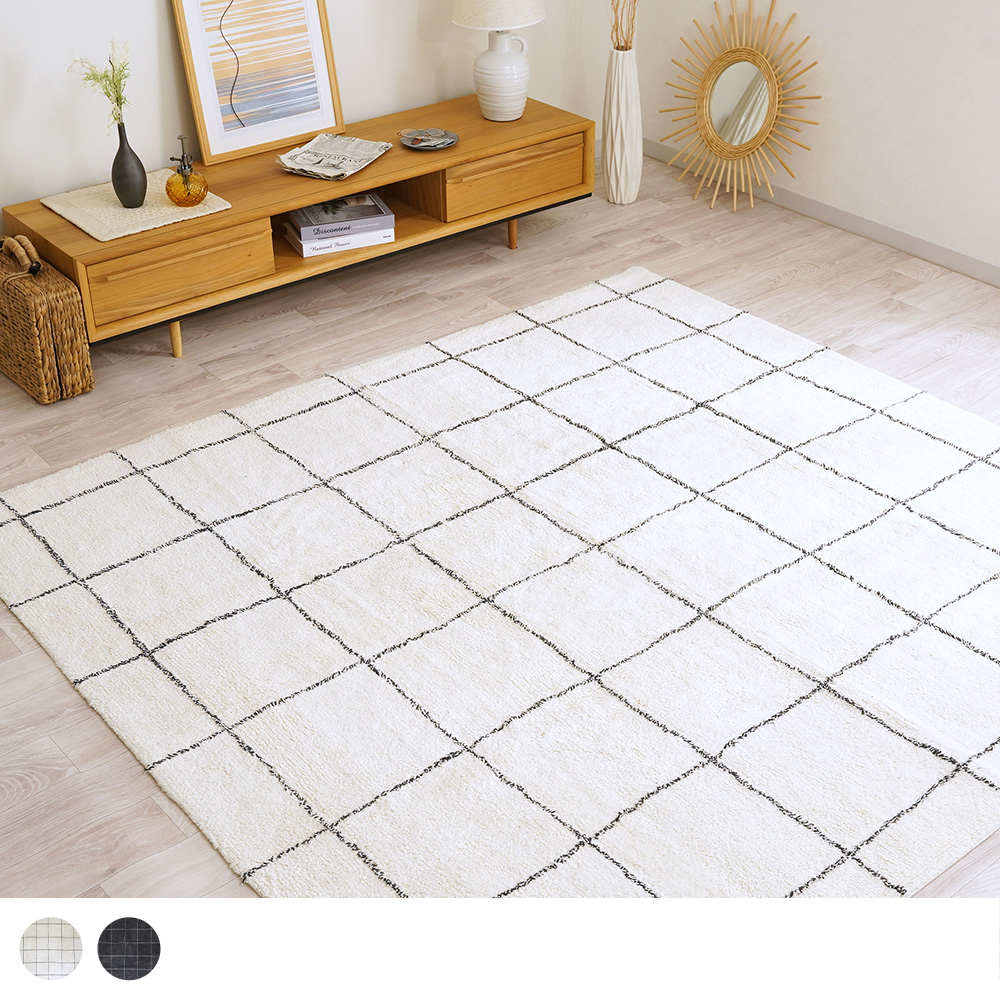 チョークで描いたようなチェックのなデザインが程よいアクセントに。カジュアルな雰囲気はもちろん、ナチュラル、北欧と幅広いインテリアにも◎そしてコットンのラグ(インド綿)の魅力は何といっても、その豊かな風合い。味わい深いラグを是非お楽しみください。