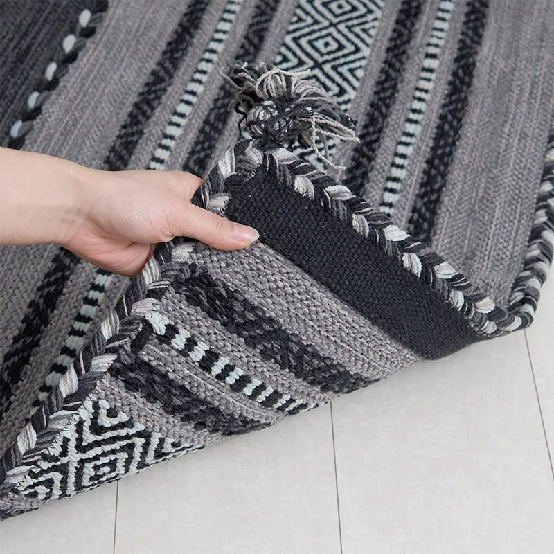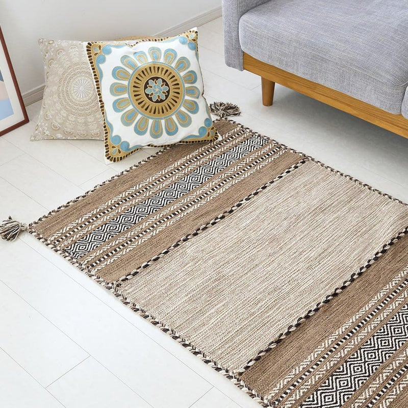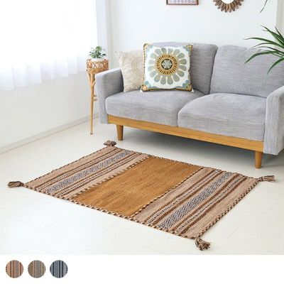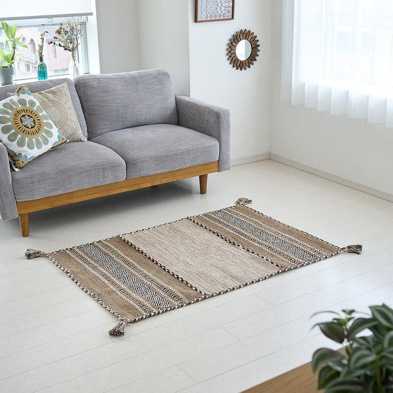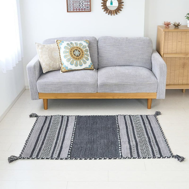 コットンの素材感にくわえて、目地の模様や幾何学模様でニュアンスを付けた手織り感のあるデザイン。縁にあしらったフリンジもくわわって、ナチュラルかつ独特のオリエンタルな雰囲気でコーディネートを楽しめます。