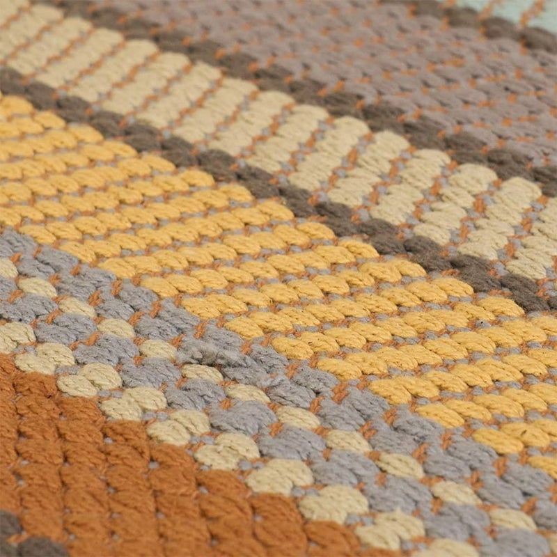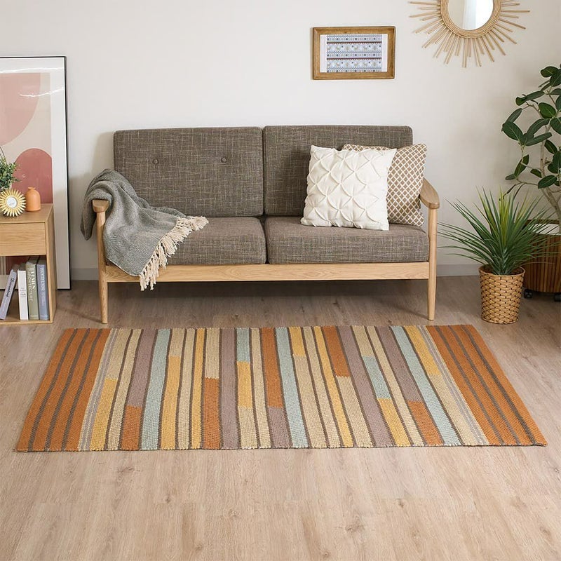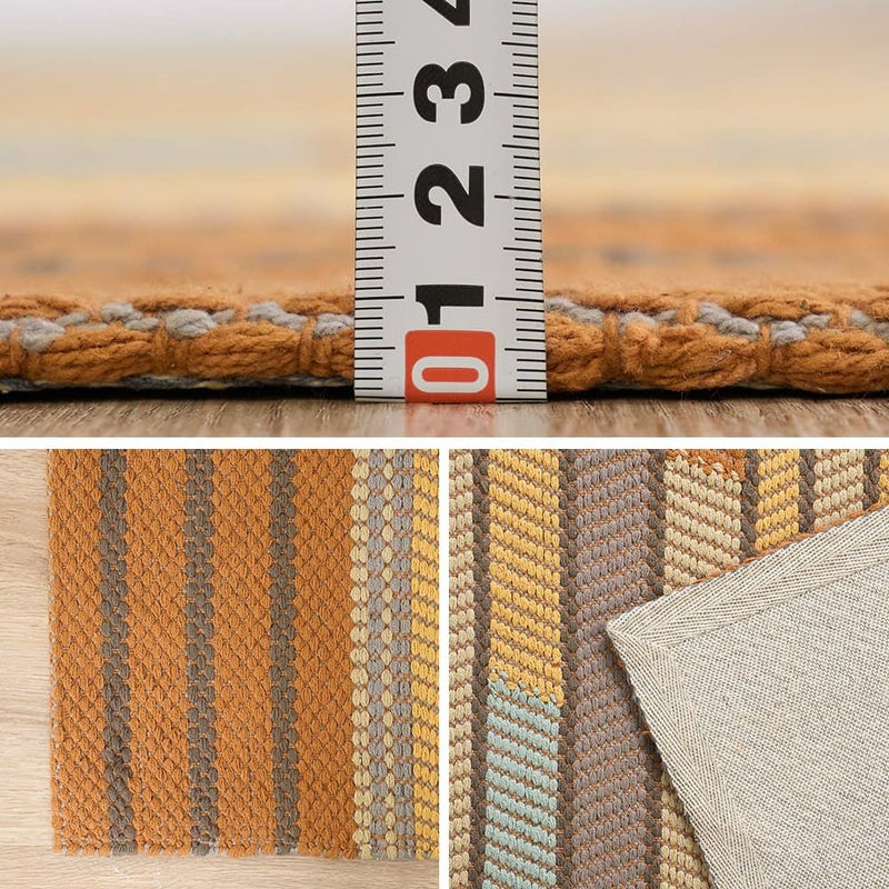 色合いも太さもランダムなストライプがぱっと目を引くデザインラグ。それぞれのストライプの中にもさらに斜線状の模様が描かれており、手の込んだ印象の1枚です。ひとつひとつ手作業で作製されているためサイズに多少の誤差があることも、一点もの感がかえって味わい深さをプラスしてくれます。