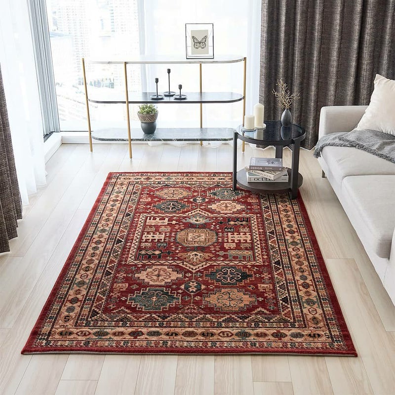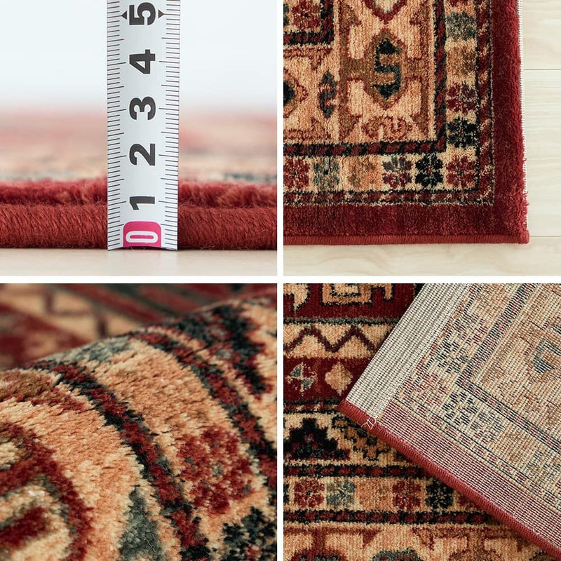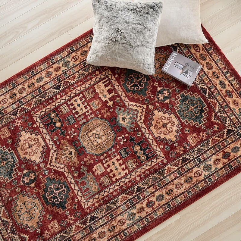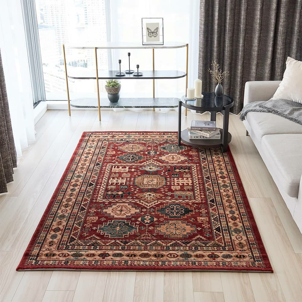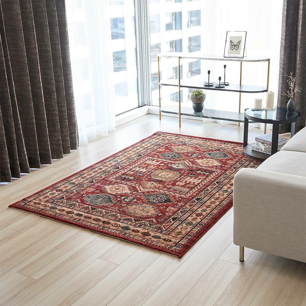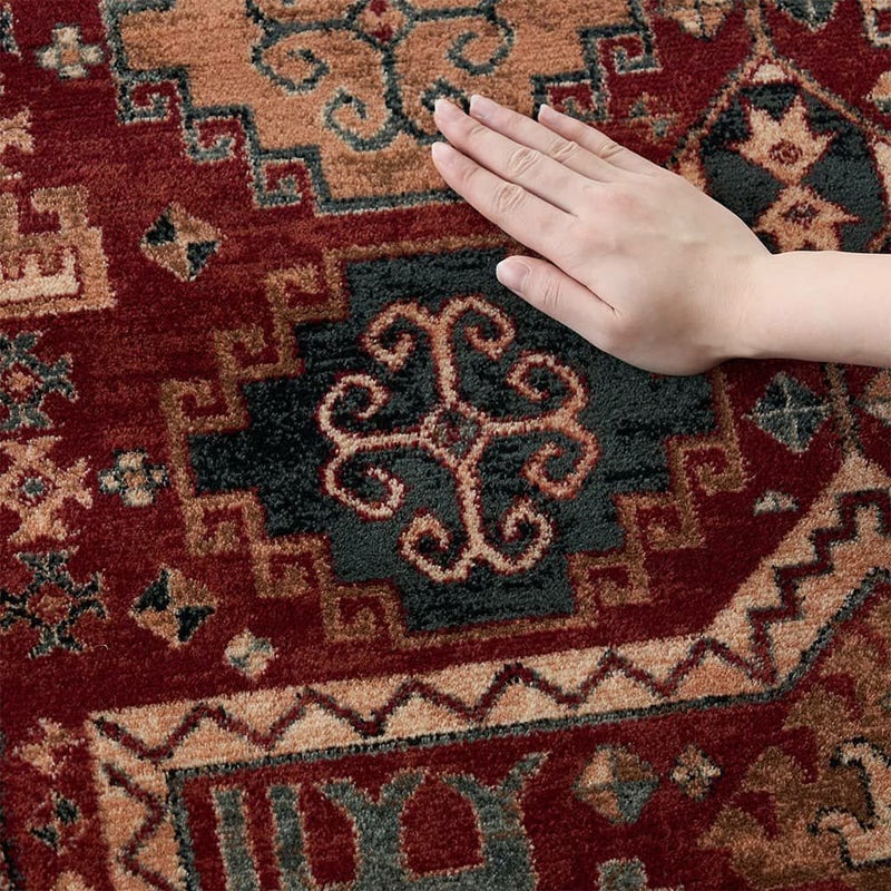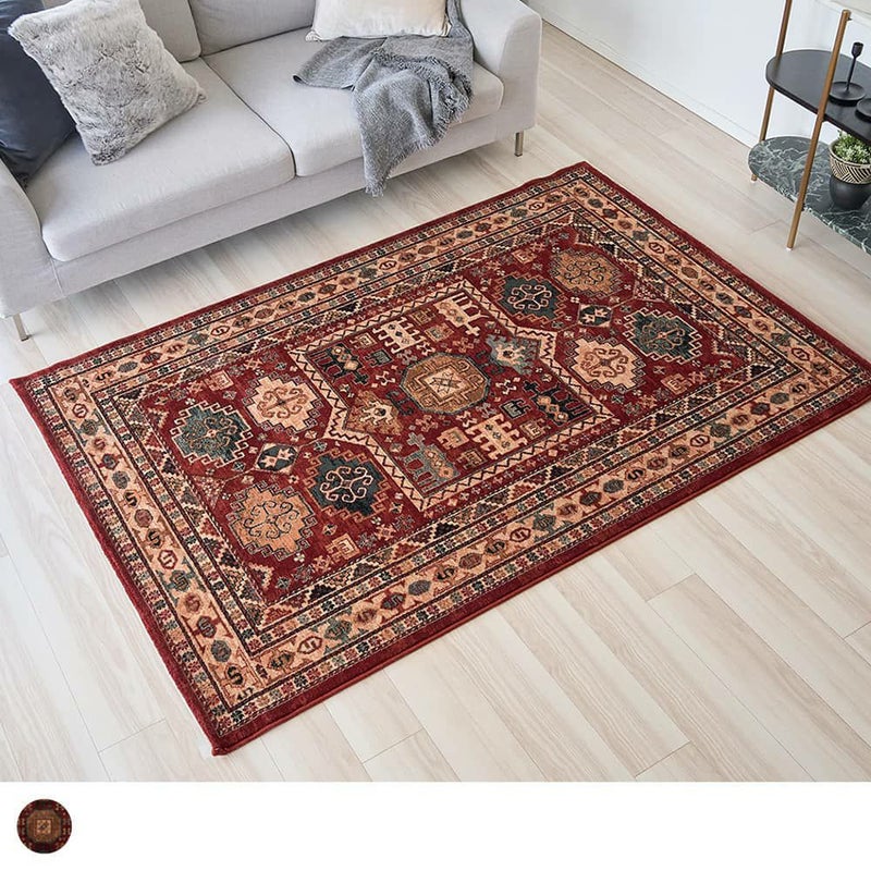 民族柄と華やかな赤が存在感を放つ、ウィルトン織ラグ