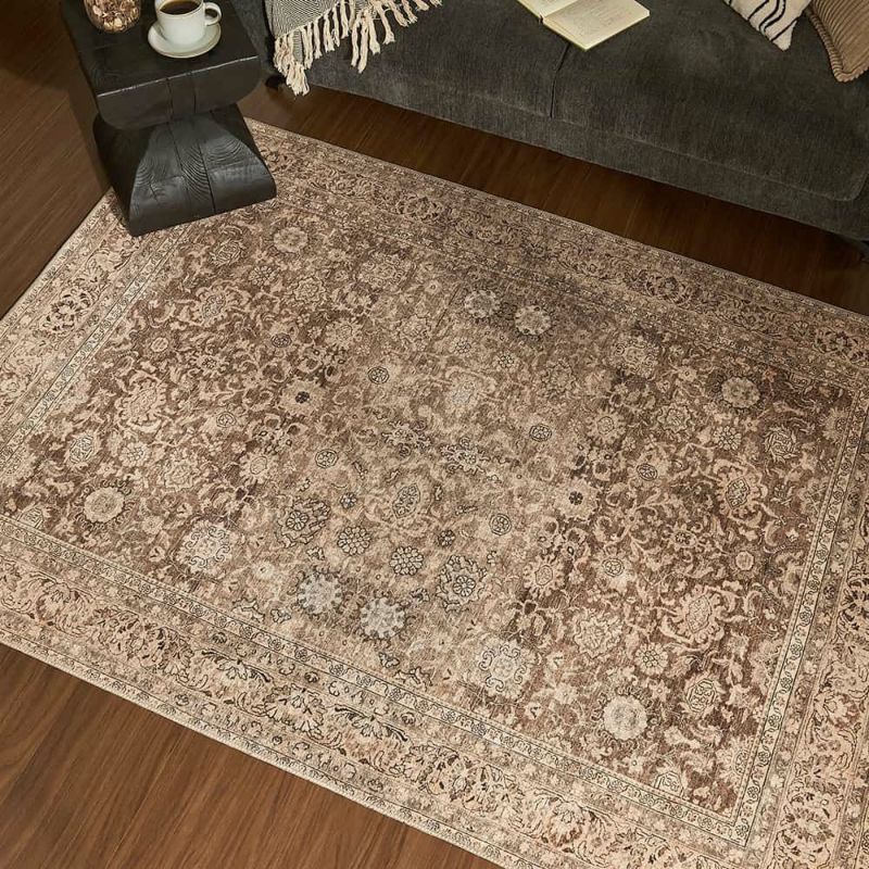 中央の草花模様を引き立てるように、縁まで細やかな柄が端までしっかりと描かれた一枚。ラグ全体に「きちんと感」が生まれ、落ち着いたブラウンの品の良さをより際立たせる仕上がりです。