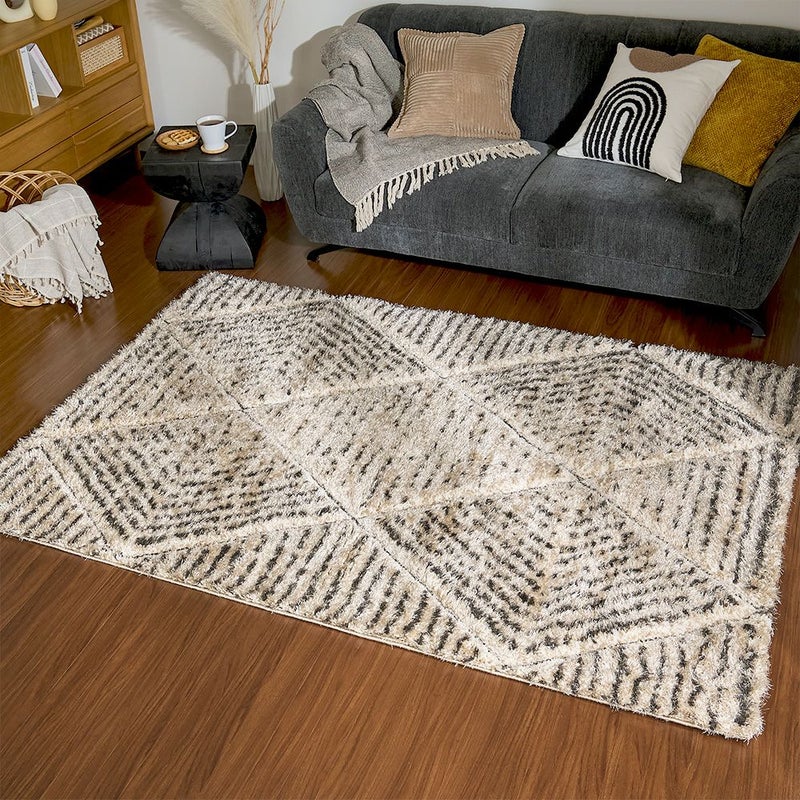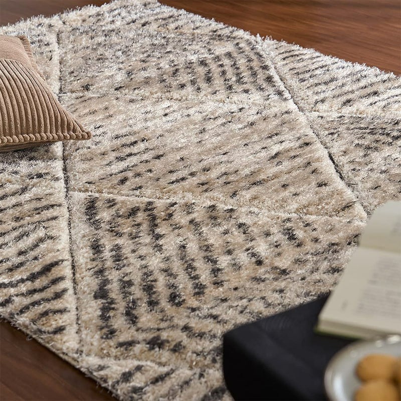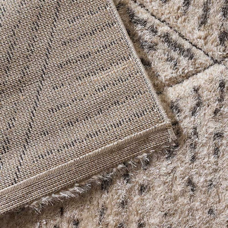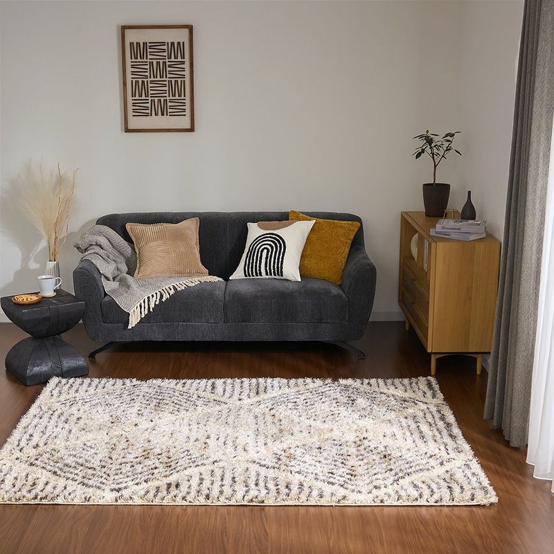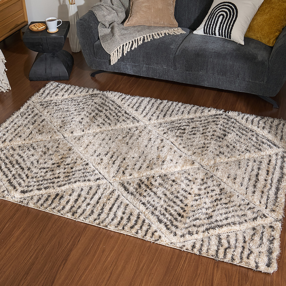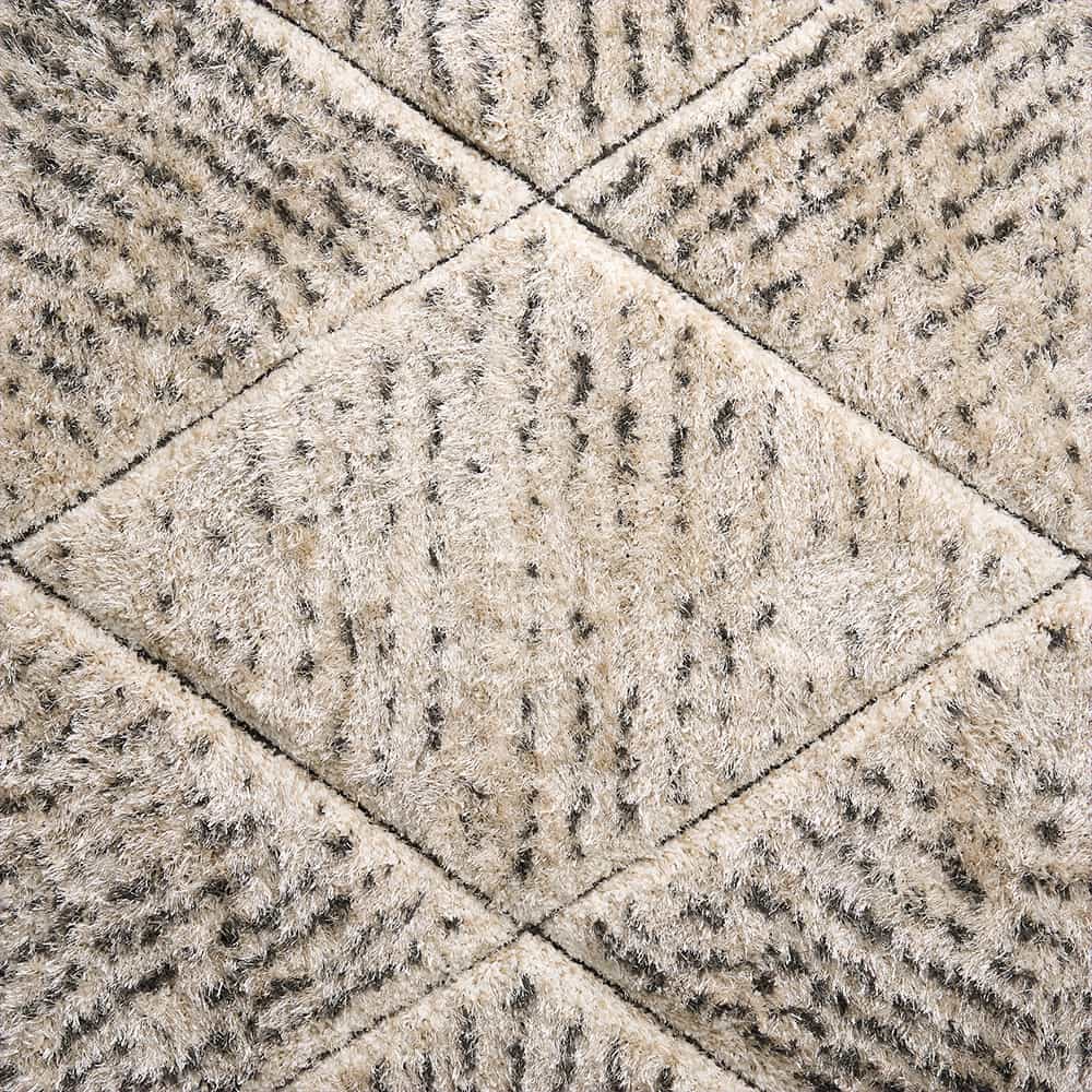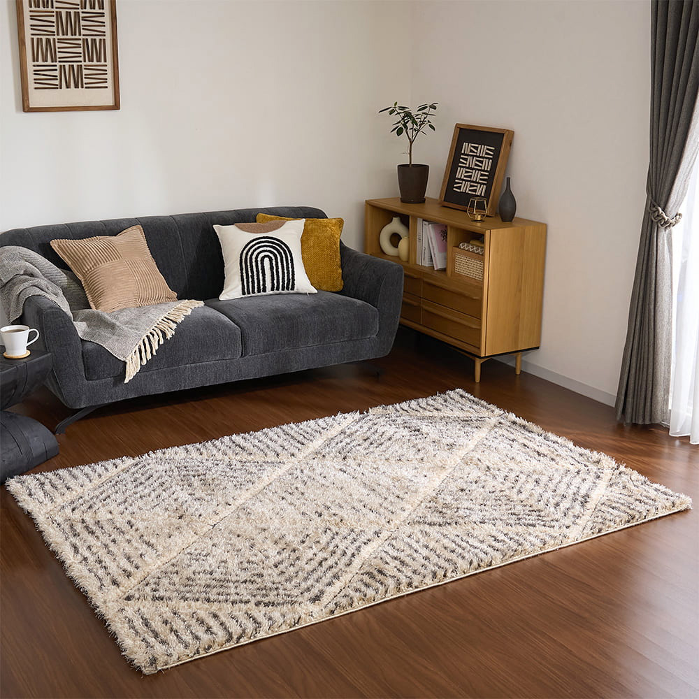 柔らかなベージュをベースに、幾何学パターンをカービングで丁寧に彫り込んだデザイン。モロッコのリヤドや北欧のホテルで目にするような「民族調 × 洗練」のバランスを絶妙に整えた一枚です。太さの異なるラインが整列することで、シャギーに自然な陰影が生まれ、光の向きで雰囲気が変わるのも魅力。朝はふわっと明るく、夕方は立体感が深まって落ち着いたムードに。旅先で感じた空気を、自宅のリビングにもそっと運んでくれます。