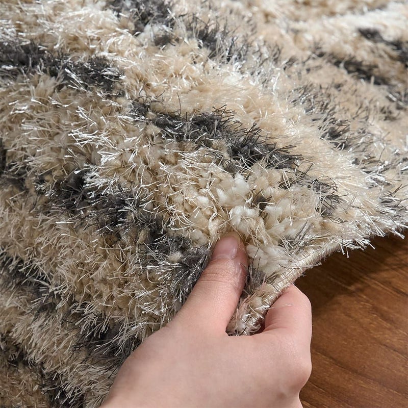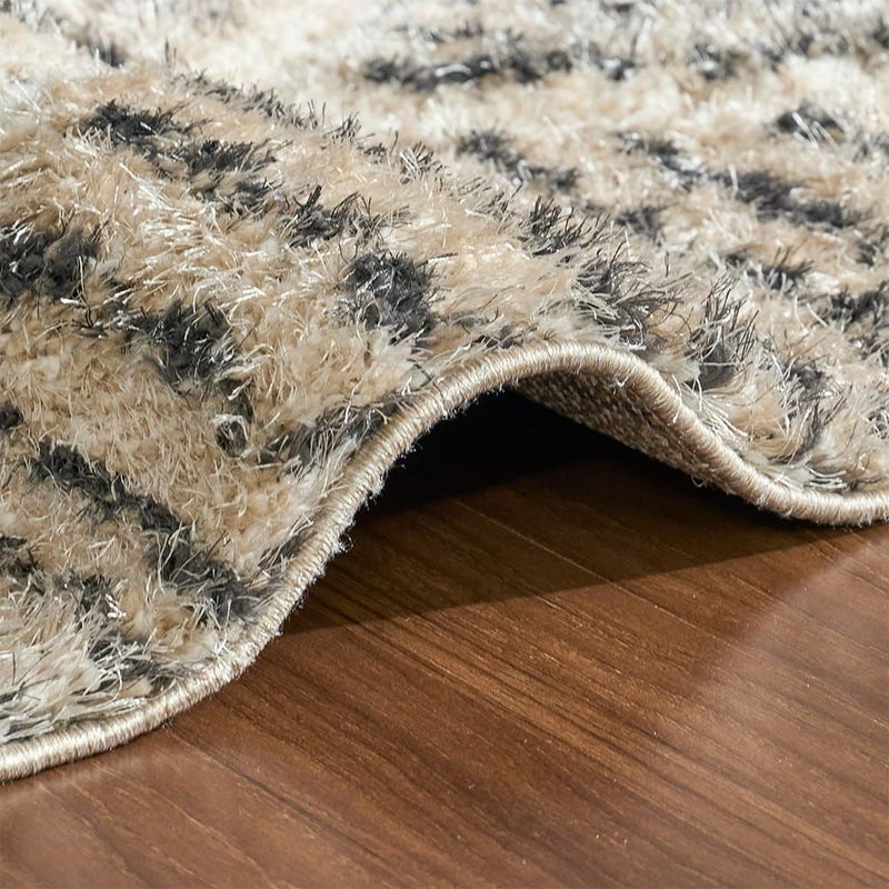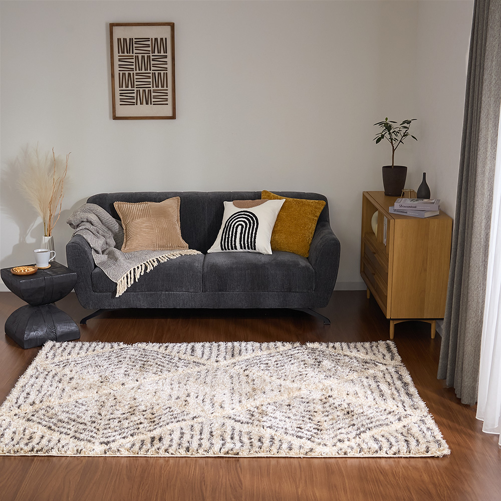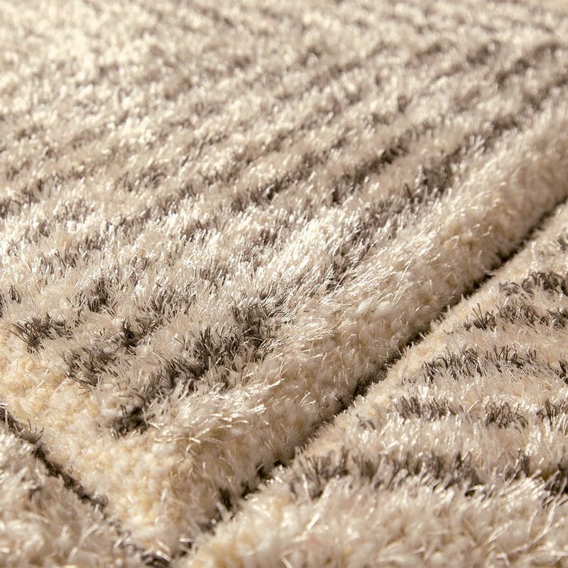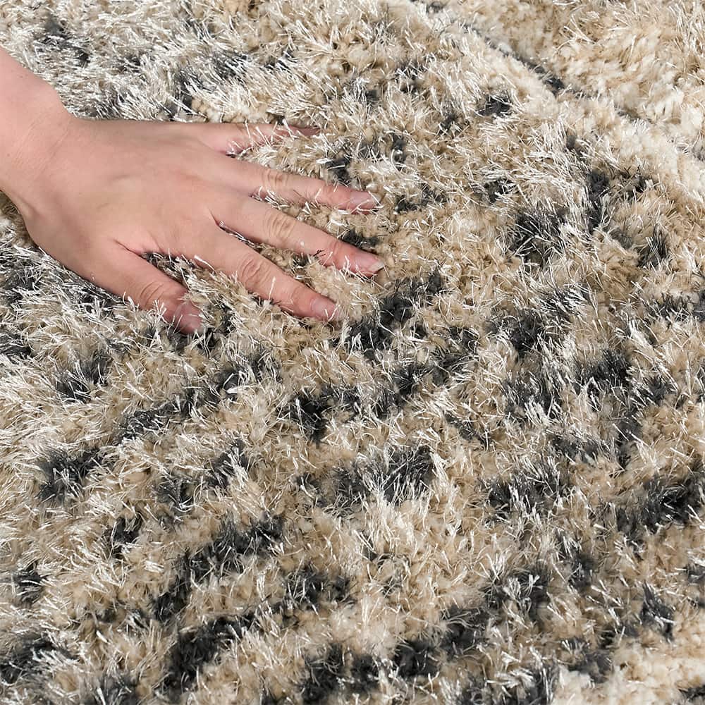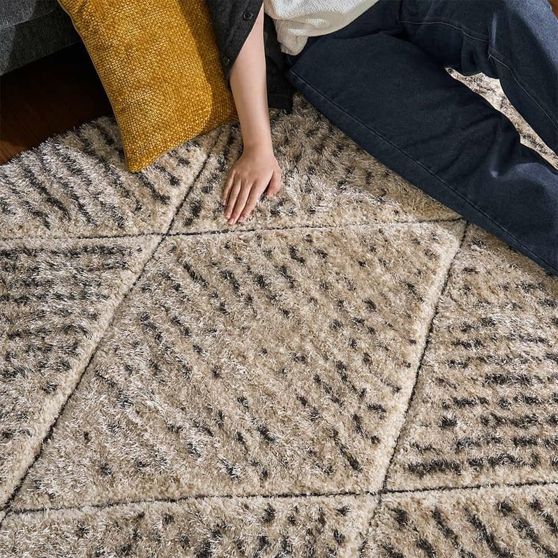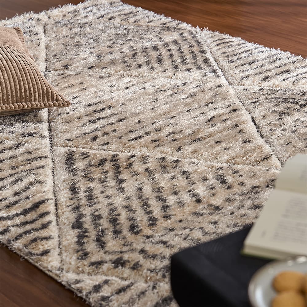 幾何学模様のラインに沿って毛足を立体的にカットしたカービング仕様。光が当たる角度によって濃淡がふわっと浮かび上がり、まるで砂漠の風紋のように、静かな陰影がゆらめきます。模様がプリントではなく「凹凸」として存在することで、シャギーの柔らかさだけでなく、視覚的にも奥行きのある表情に。シンプルなリビングに敷いても単調にならず、置くだけで空間に「動き」と「リズム」が生まれます。
