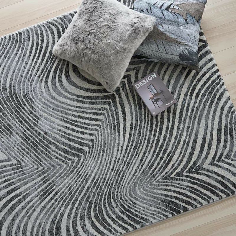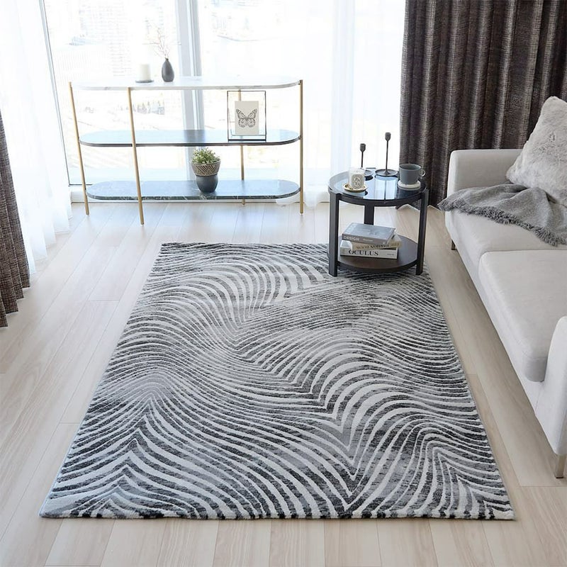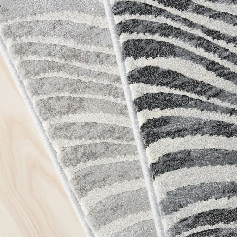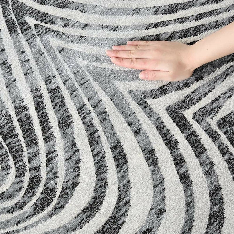砂丘に風が吹きつけることで作られる「風紋」をイメージして、黒とグレーのカーブ模様を表現したウィルトン織のラグです。伝統の製法で美しく描かれた曲線が、ダイナミックさや力強さを感じさせます。「カービング加工」で凹凸をつくることで立体感をもプラスした、技巧が詰まった1枚です。