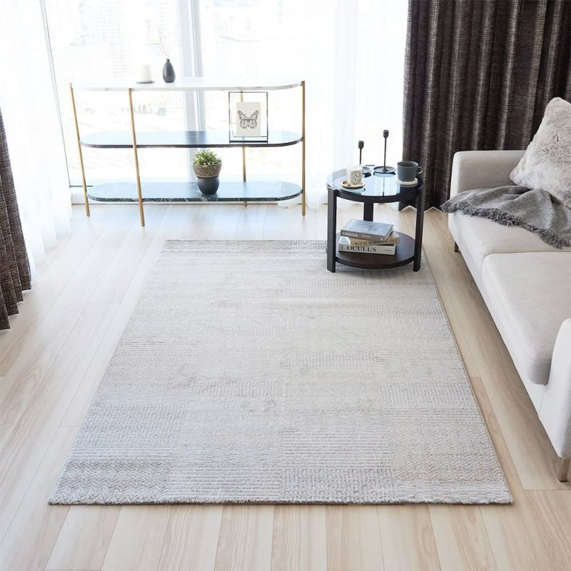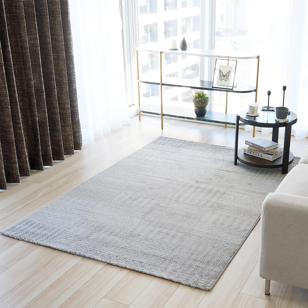 シンプルなデザインながら、パネルのように組み合わせたさまざまな織柄が目を楽しませてくれるラグです。毛並みの方向でも色が変化する表情豊かな1枚は、飽きがこないのが魅力。「出会い」を大切にしたいあなたに、長く愛用していただきたいラグです。