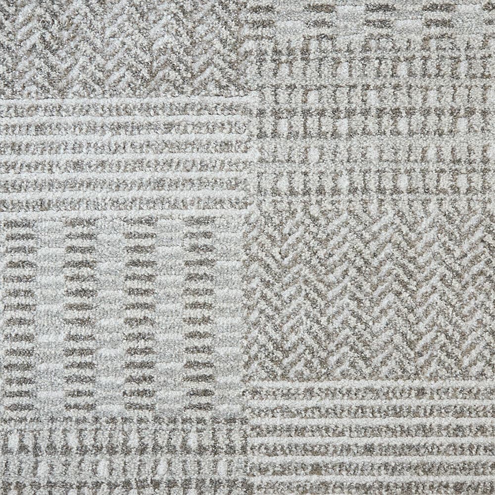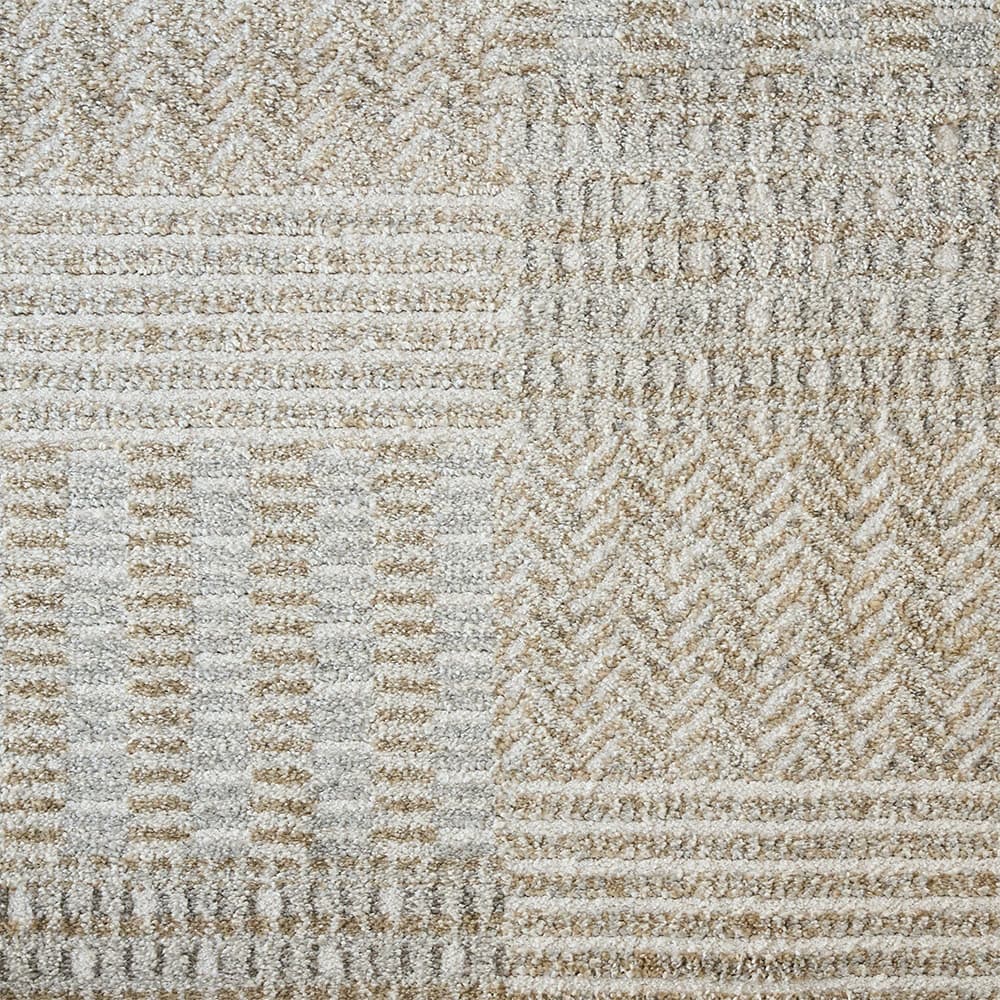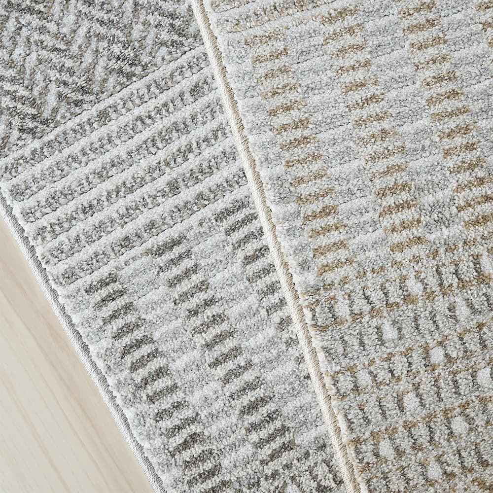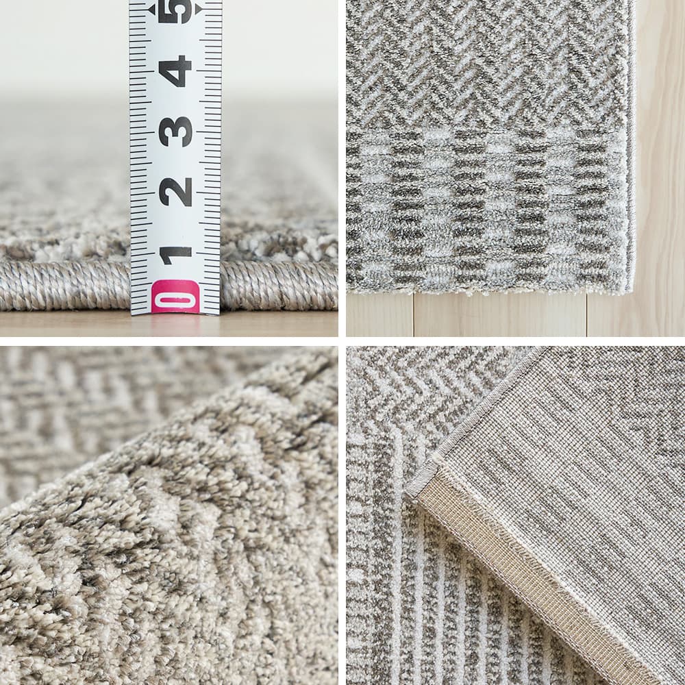 ストライプやヘリンボーンなど種々の模様をパネルのように組み合わせた、モダンデザインのウィルトン織ラグです。毛並みの長さで凹凸を表現するほか、光沢のあるフリーゼ糸を織り交ぜ、さまざまな表情が見られるラグに仕上げています。