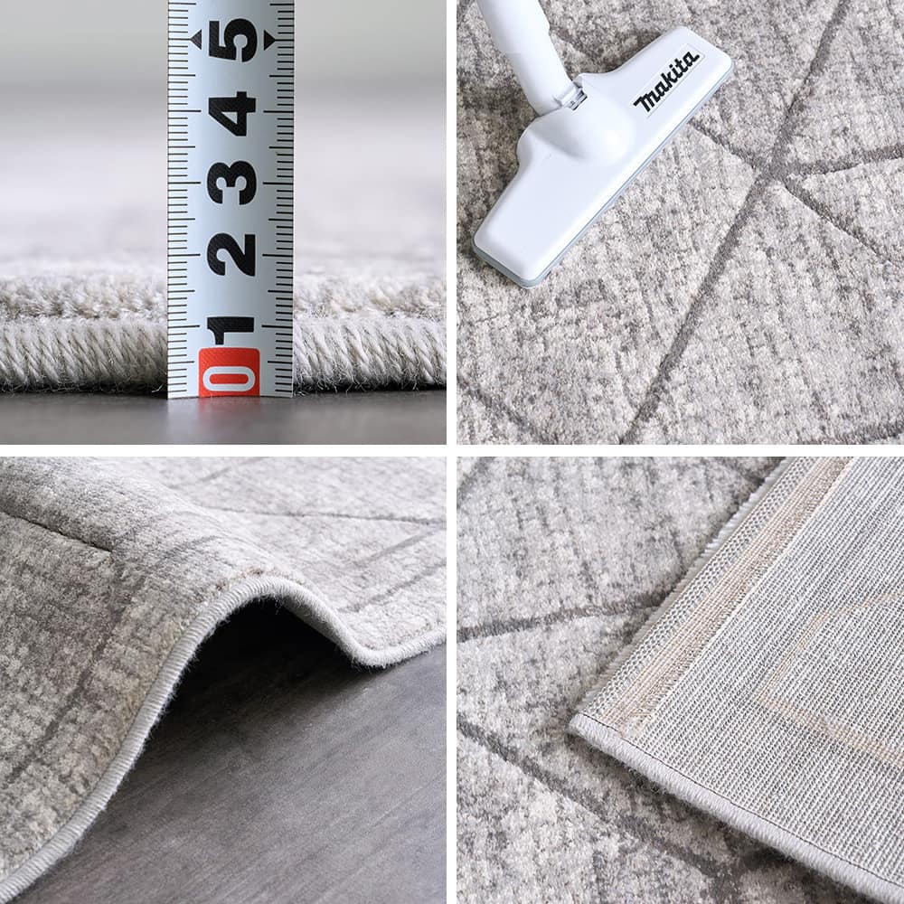 ポリプロピレン100%の糸を使用し、更にヒートセット加工を施したことでウールのような柔らかさに。パイル長は約11mmと程よい厚みです。職人技が光る美しいデザインと、やさしい手触りがに非日常的な空間に。