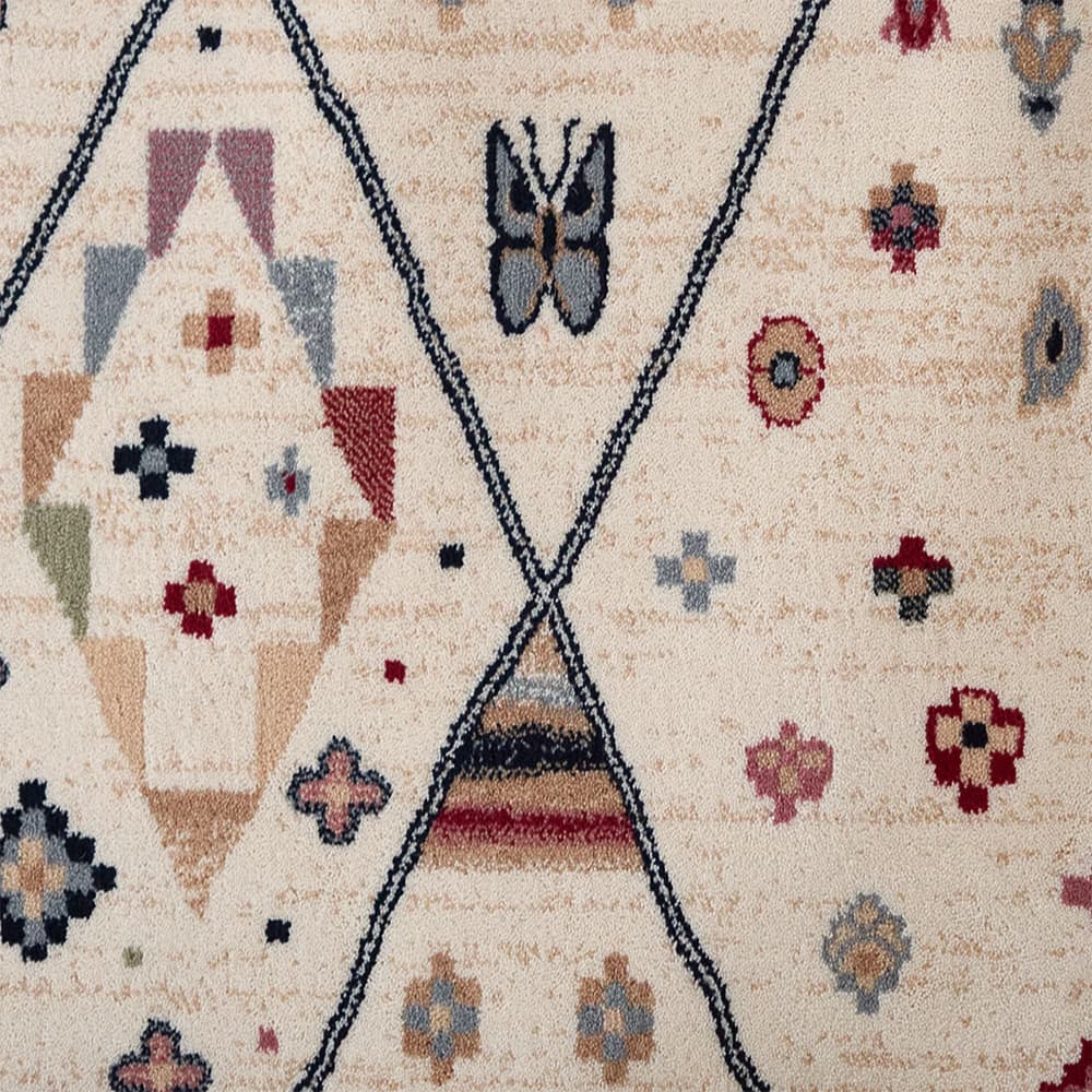 くっきりと輪郭をとったネイビーの格子模様に、カラフルな民族柄をちりばめたウィルトン織ラグです。手織りの風合いと少しくすみがかったカラーリングにより、にぎやかさとともに素朴な優しさを感じられます。