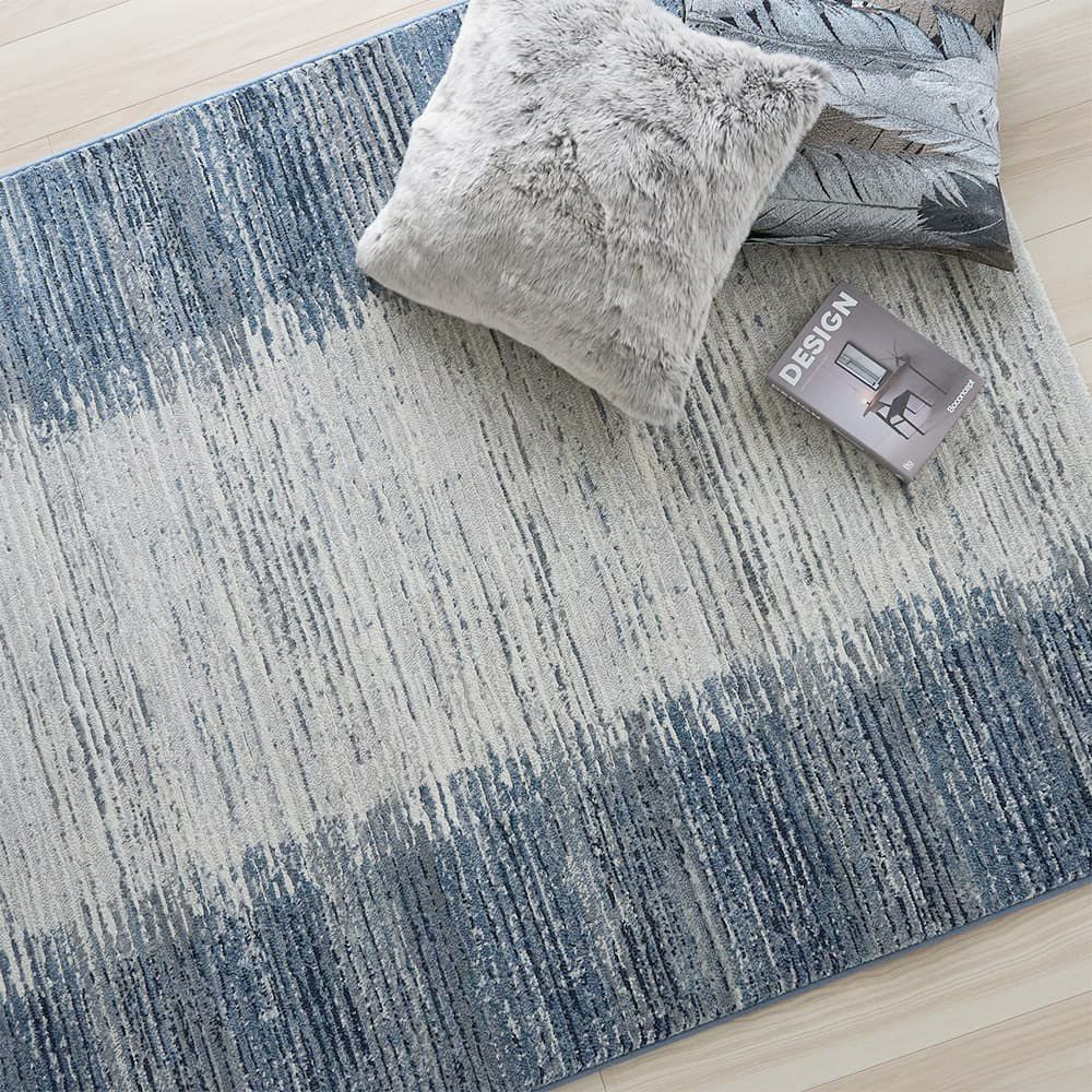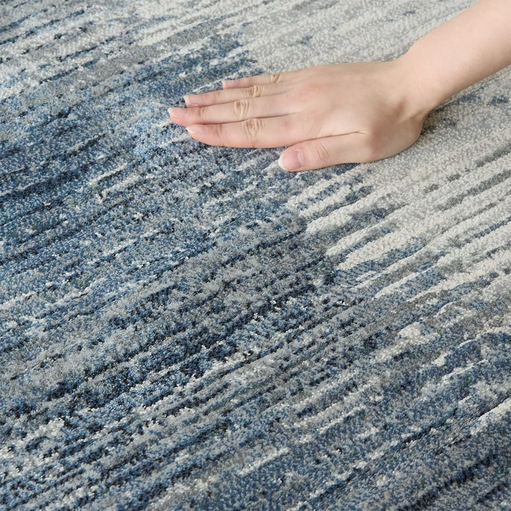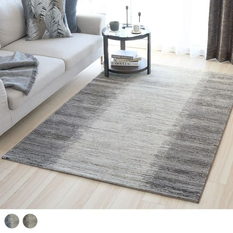 ラグ両端に落ち着いた色味のグラデーションを、全体にかすれたストライプを描いたデザインラグ。ラインに沿って「カービング」と呼ばれる手彫り加工を仕込むことで、立体感を表現しています。押すと沈み込むような深い毛並みも相まって、見ても座ってもコンフォタブルな1枚です。