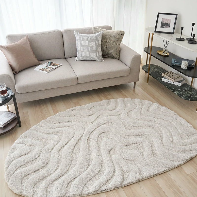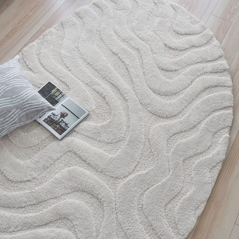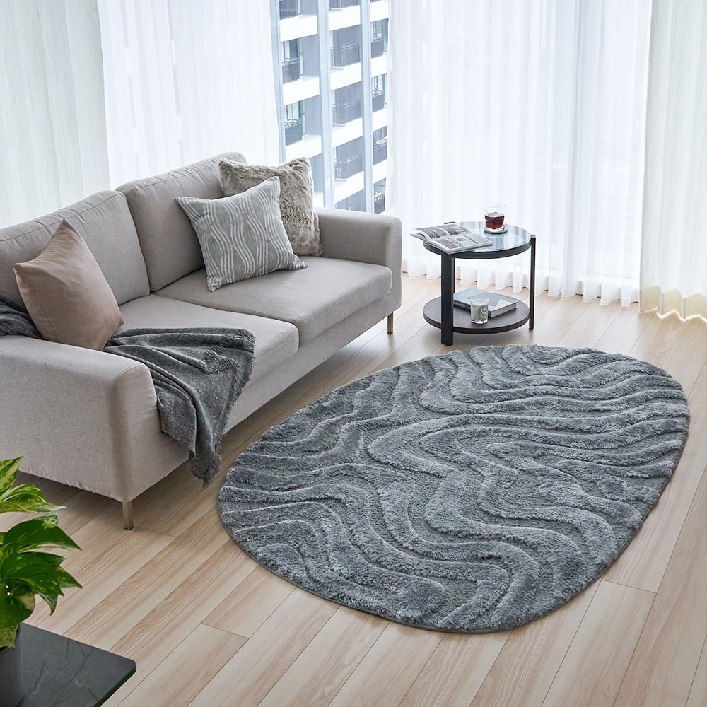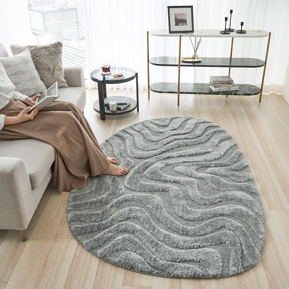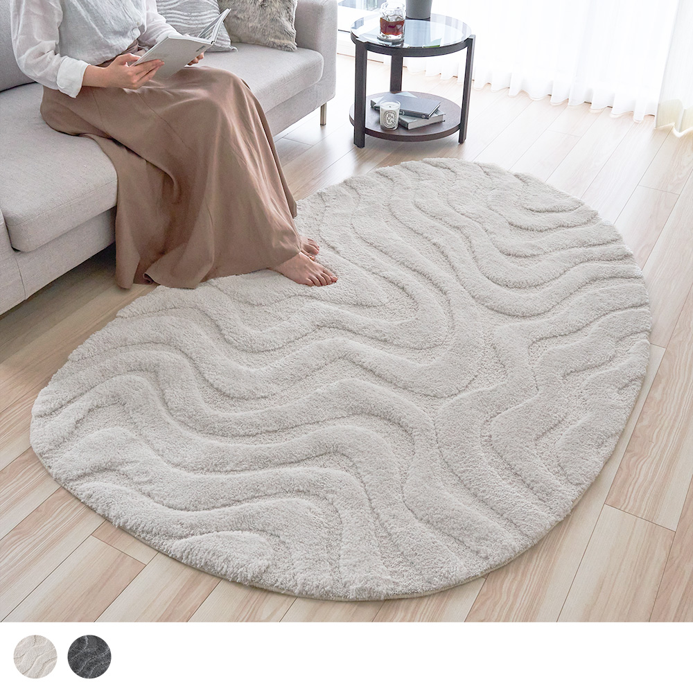 光と陰影が移ろうたびに、静かに表情を変える、感性を満たすアートラグ。卵型のやわらかなフォルムに刻まれたウェーブラインは、朝の柔らかな自然光、夕暮れの淡いグラデーション、夜の間接照明、どの時間もこのラグにそっと表情を与え、空間に「動き」を生み出してくれます。直線の多いリビングに、有機的な余白をひとつ置くだけで、空気はやわらぎ、空間全体が心地よく整っていく。日々の暮らしに寄り添いながら、大人の感性を静かに満たす一枚です。