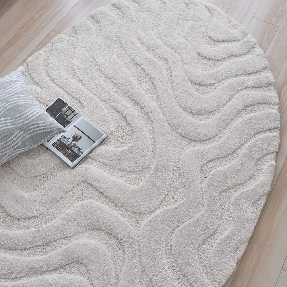 休日の午後、ふと手に取った雑誌をゆっくりめくりながら、ソファに深く身体を預ける。やわらかな光がラグの凹凸にそっと落ち、ページをめくるたびに、陰影が静かに表情を変えていく。緩やかな円形フォルムとウェーブラインは、忙しさの中で固くなっていた心をゆるやかにほどき、空間に「静かで上質な余白」を生み出してくれる。慌ただしい日々のすぐ隣で、自分の感性を整える静かなひととき。そんな上質な時間を、ラグと過ごしてみませんか。