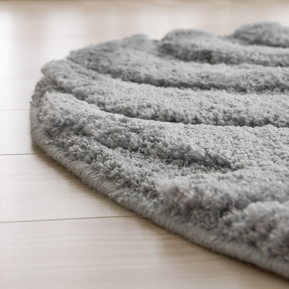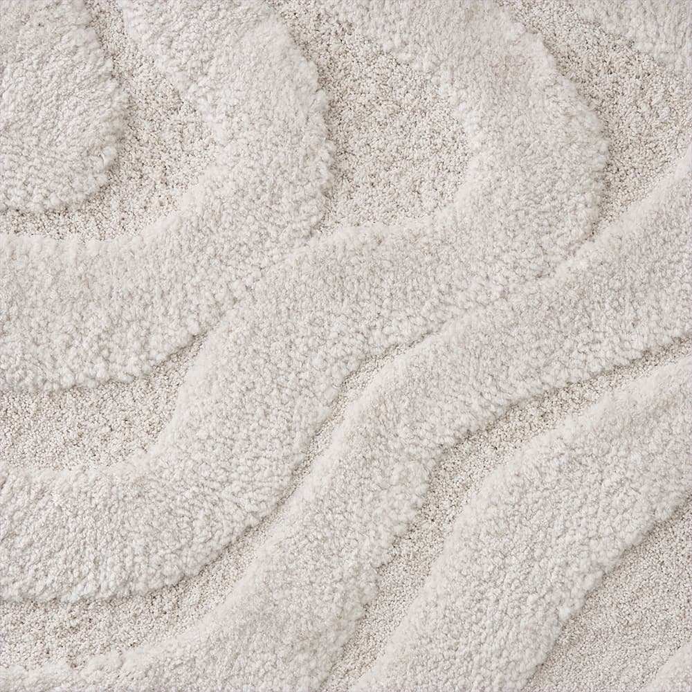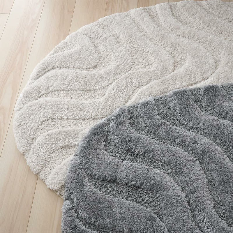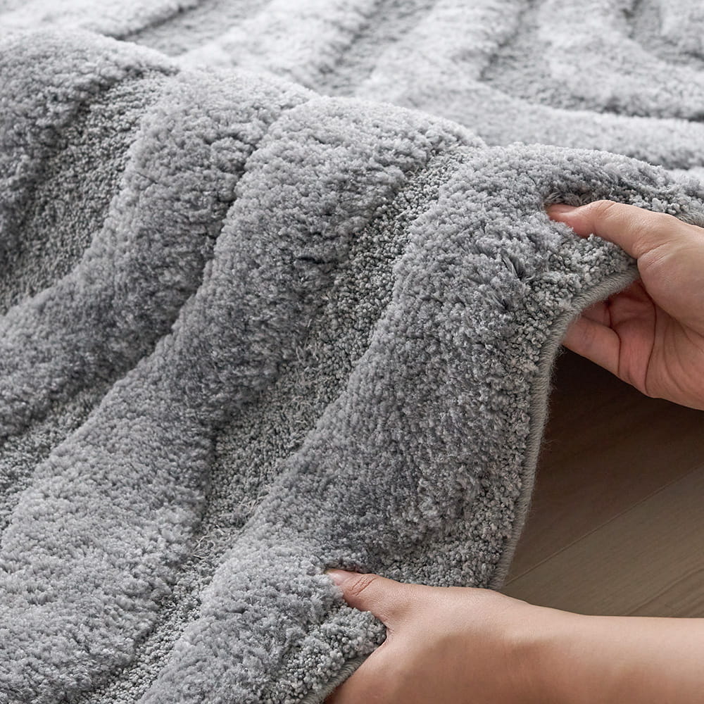 立体的に彫り込まれた凹凸が、光と影のリズムをつくり出すディテール。25mmのやわらかなパイルに高さの差を持たせることで、ウェーブラインが彫刻のように立体的に浮かび上がります。光が当たる部分はふんわりと明るく、陰の部分は静かに沈み、時間帯や照明の種類によって「違う表情」を見せてくれるのも魅力の一つ。素足で触れた時のふかふかとした足触りは、視覚だけでなく触覚でもやさしく癒してくれる心地よさです。