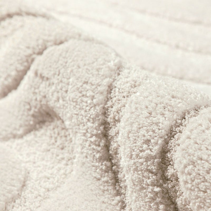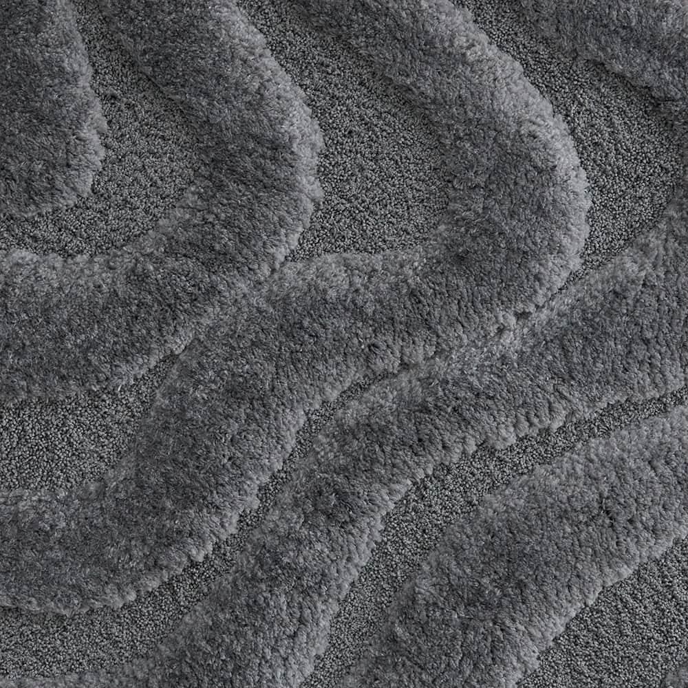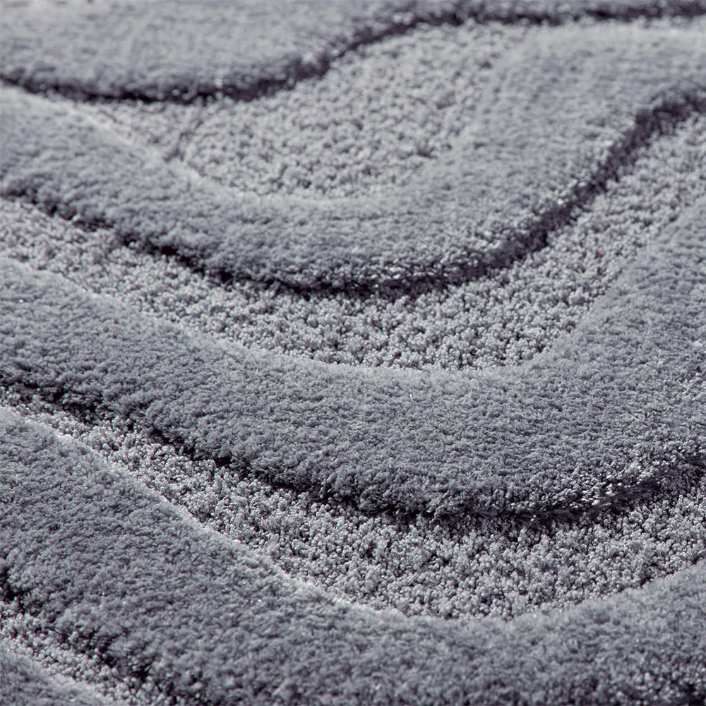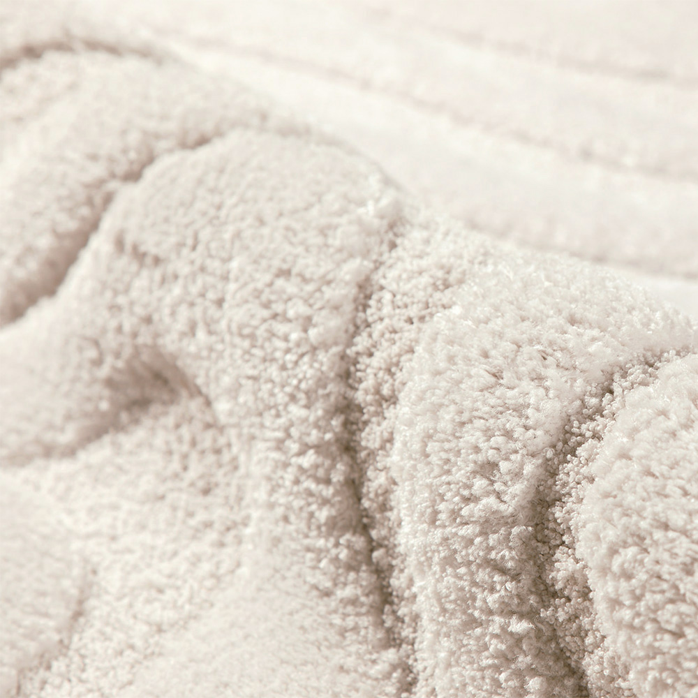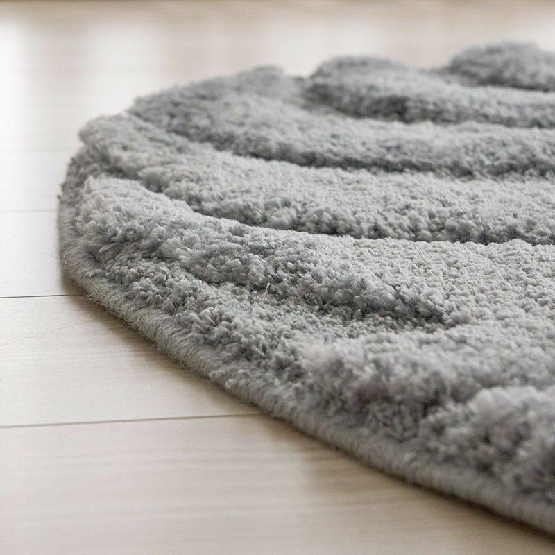 立体的に彫り込まれた凹凸が、光と影のリズムをつくり出すディテール。25mmのやわらかなパイルに高さの差を持たせることで、ウェーブラインが彫刻のように立体的に浮かび上がります。光が当たる部分はふんわりと明るく、陰の部分は静かに沈み、時間帯や照明の種類によって「違う表情」を見せてくれるのも魅力の一つ。素足で触れた時のふかふかとした足触りは、視覚だけでなく触覚でもやさしく癒してくれる心地よさです。