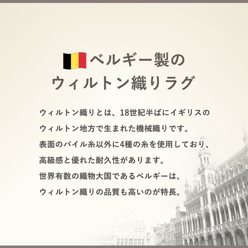 裏面には、ウィルトン織りならではの確かな縫製が丁寧に施された一枚。端まで美しい仕上げは、見えない部分にまで上品さが漂います。床にきちんと馴染む適度な厚みと重みで、ずれにくく安心感も。目に触れない裏面 にまで気品を纏わせたつくりが、大人の暮らしを静かに、上質に支えてくれます。