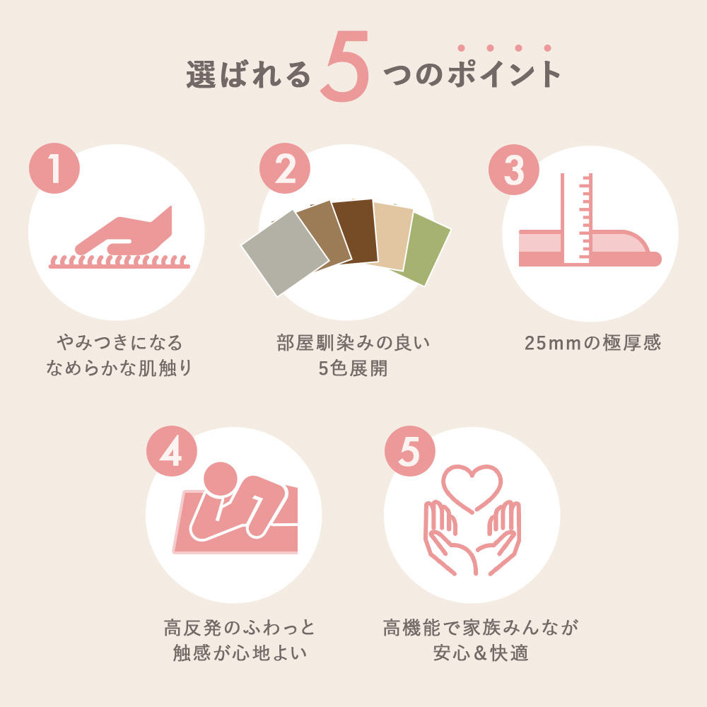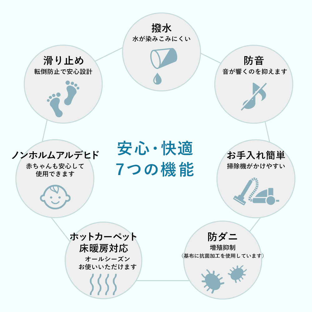 | 機能 | 床暖房&ホットカーペット対応・洗濯可(手洗い)・防ダニ・抗菌・防音・滑り止め・不織布 |