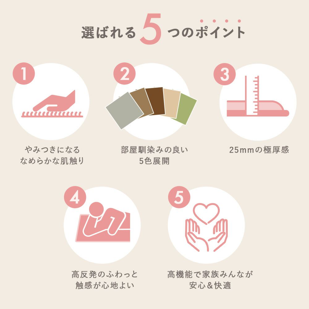 厚さ約20mmの高反発ウレタンが、体を優しく支え、まるで布団の上で寝転んでいるような快適さ!長時間座っていても疲れにくく、家族みんなのくつろぎ空間を演出してくれます。防音機能で下の階への音も気にならないから、お子様やペットが走り回っても安心!とろけるようなフランネルの肌触りと共に、家族みんなで至福のひと時をお楽しみください。