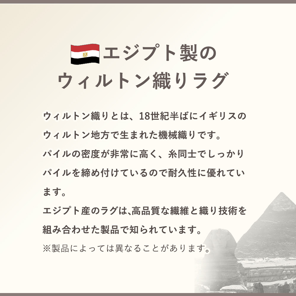 表面に熱処理を行い、パイルに弾力や柔らかさを与えるヒートセット加工で、上質な踏み心地を実現。耐久性に優れているのも嬉しいポイントです。