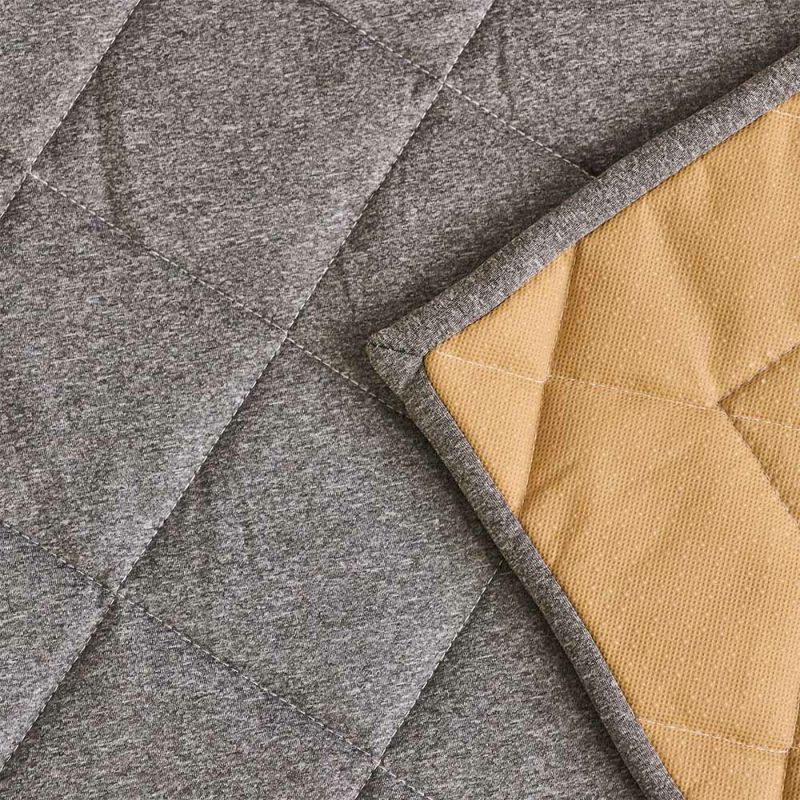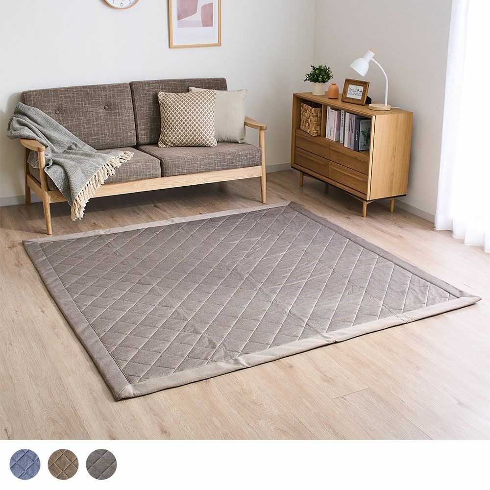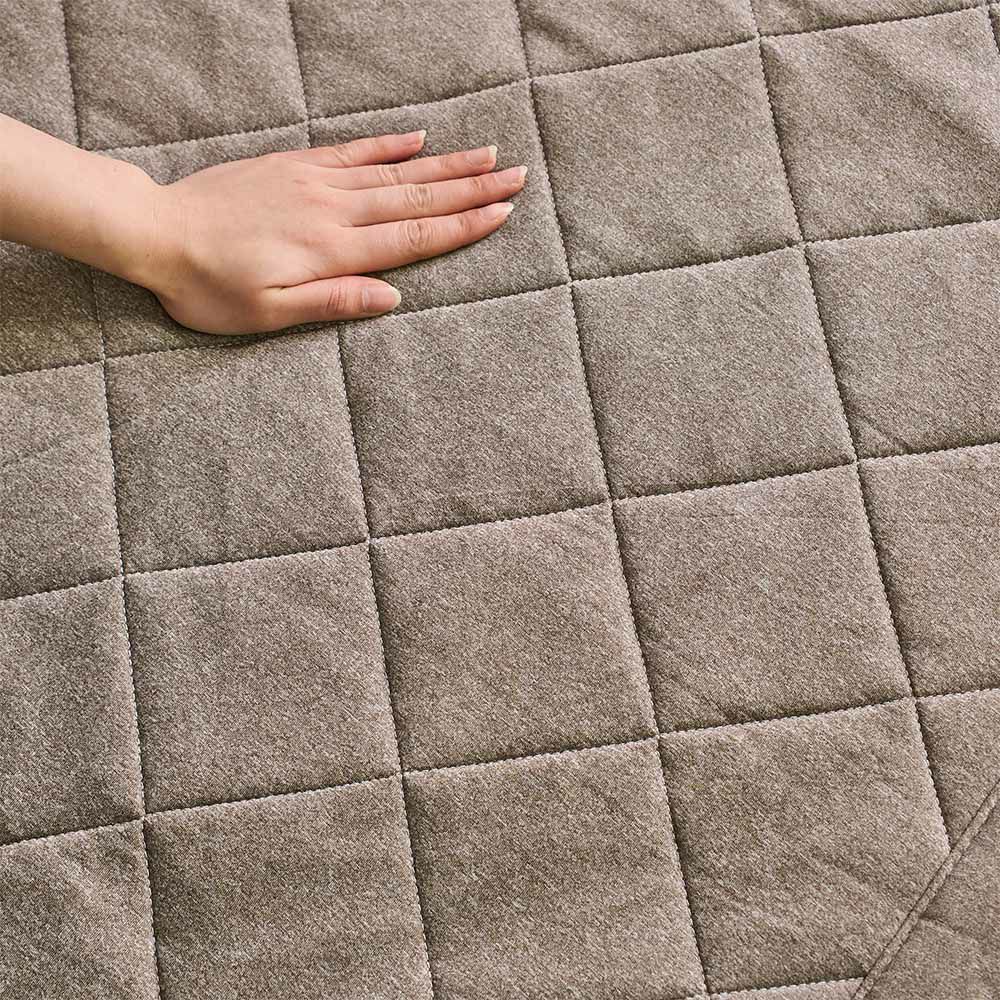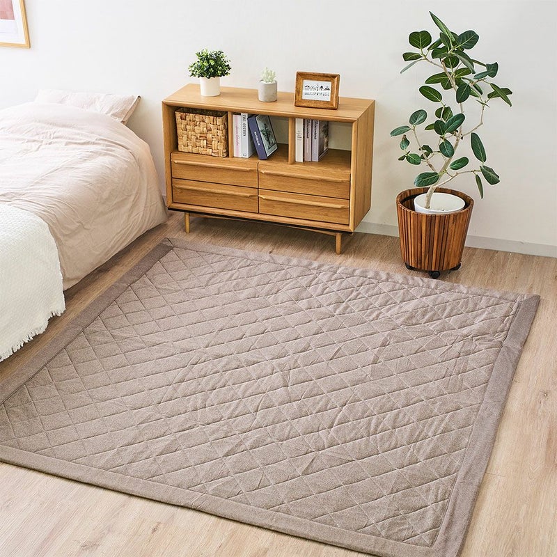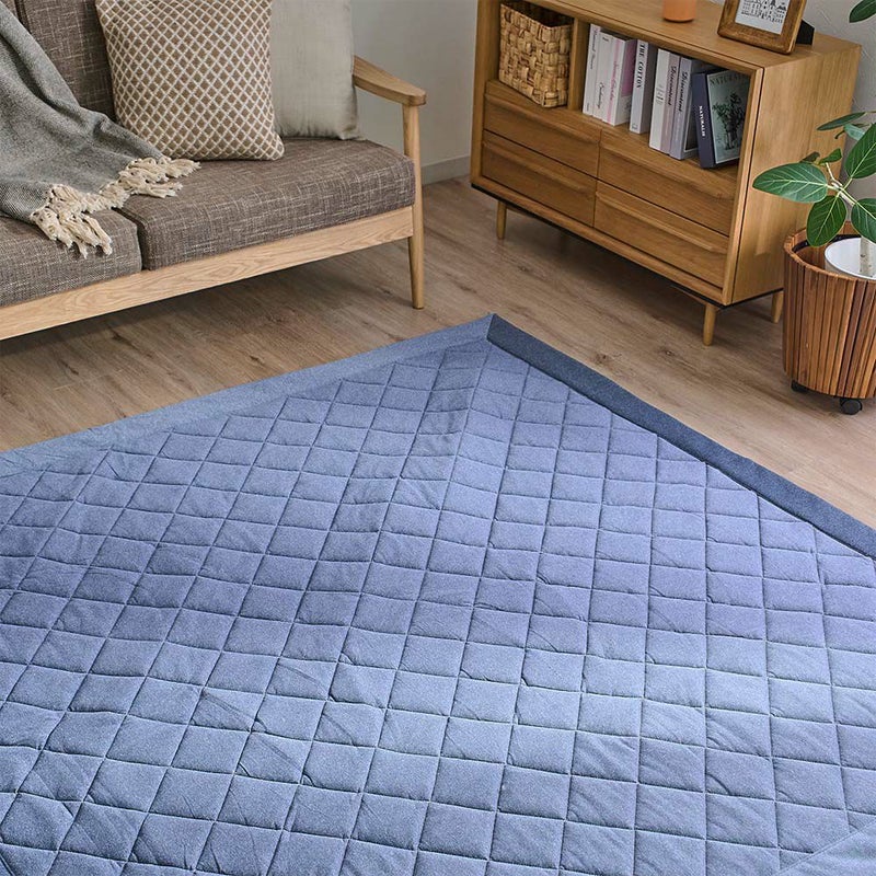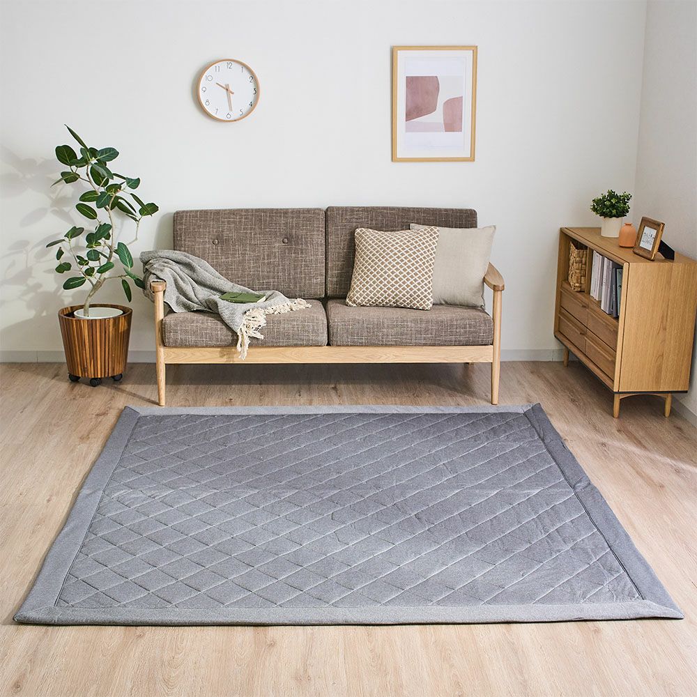 ホットカーペットカバーやこたつの敷布団としても、便利に使えるキルトラグ。熱源に対応しているのはもちろん、ニット生地で中綿入りだから冬はぬくぬく。夏もサラッとした生地感で、年中ゴロンとしたくなる使い心地です。