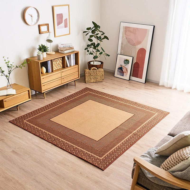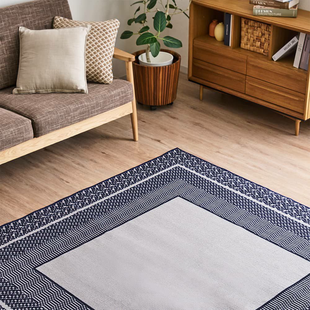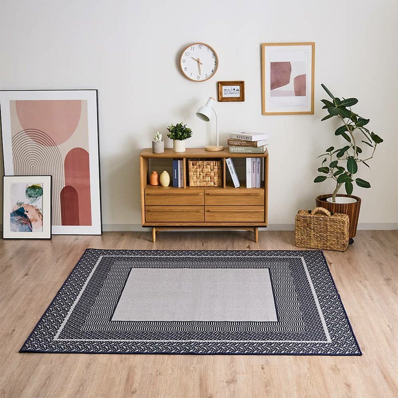 縁取りでだけで表現されたスクエア柄は、シンプルで整然とした雰囲気。固すぎないスタイリッシュさをプラスしてくれます。椅子の出し入れがしやすい薄手ラグで、汚れに強い撥水加工&手洗いできる仕様だから食事の汚れが心配なダイニングにもぴったりの1枚です。