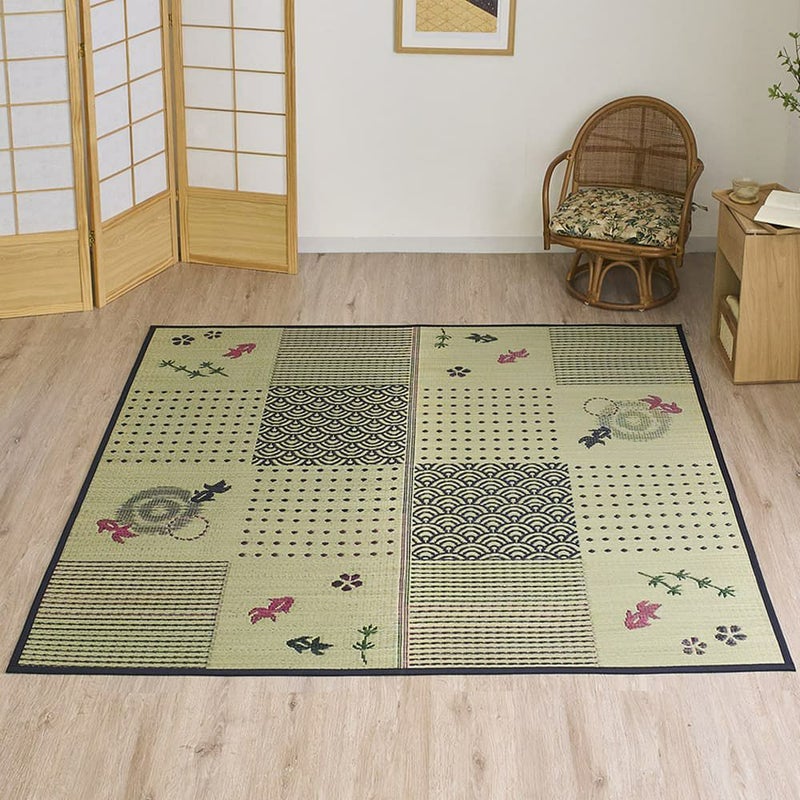 い草の涼やかでさらっとした心地よさに、金魚たちが泳ぐ姿を描いた何とも可愛らしいデザイン。ナチュラルな雰囲気の中にも趣のあるい草ラグで暑い夏を快適に過ごしてみませんか?