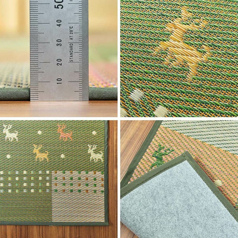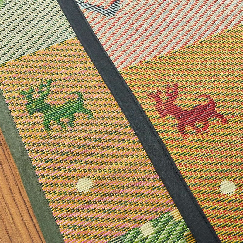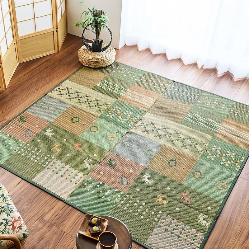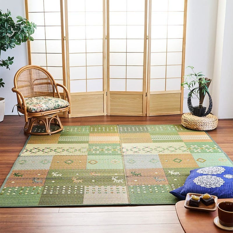 ギャッベデザインの素朴で暖かみある風合いと、畳の自然を感じさせる懐かしさ。どこか相通ずる二つが出会って生まれた、ほっこり可愛いい草ラグです。表地に100%のい草を使用しているので、敷いた瞬間からい草の香りに包まれます。